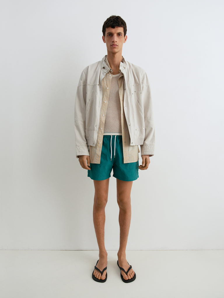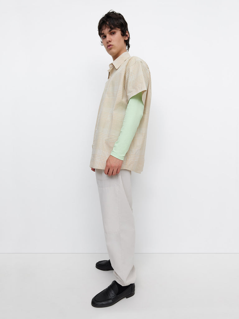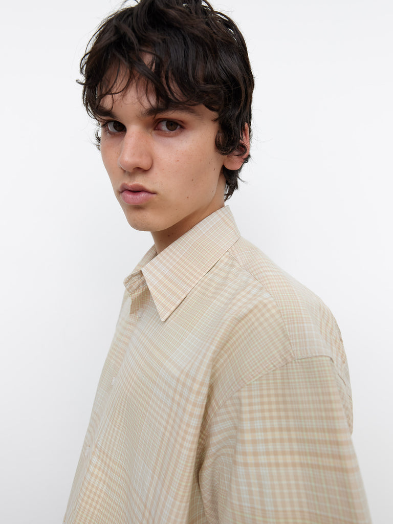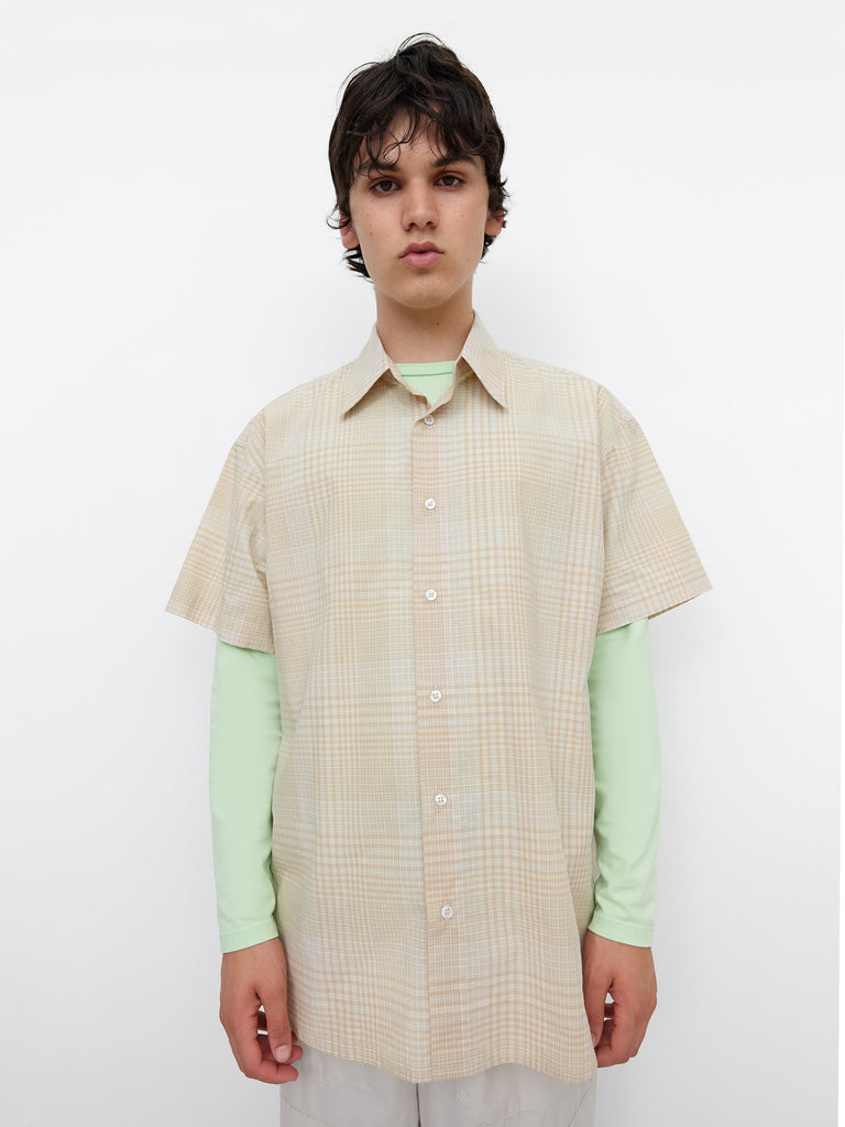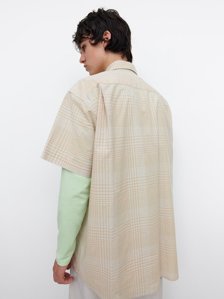 Brown men’s short-sleeve checkered shirt in a loose fit. Designed with a pointed collar and a full button-down front. Features a soft check pattern. Straight hem and a laid-back silhouette.