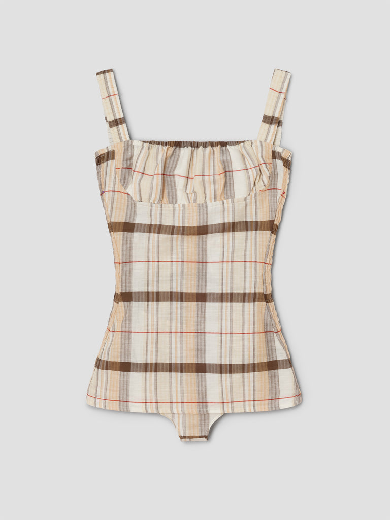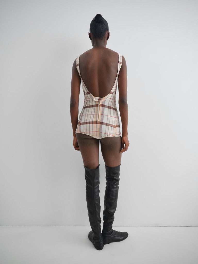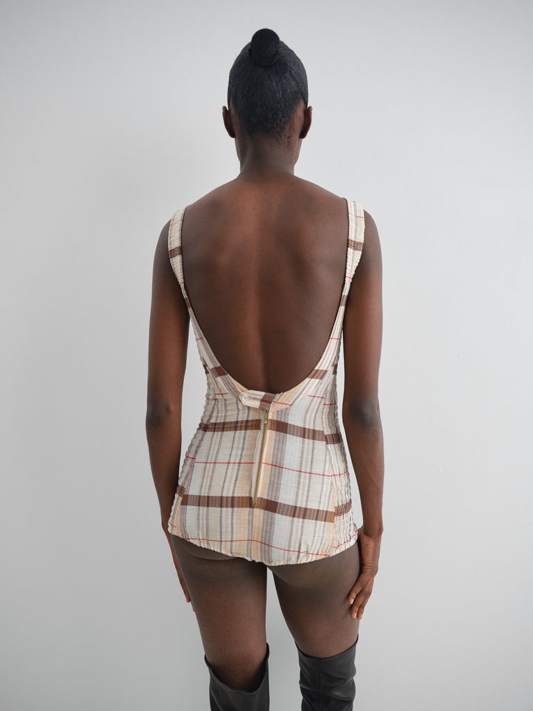 Brown checkered square-neck bodysuit with mini dress-like fit.