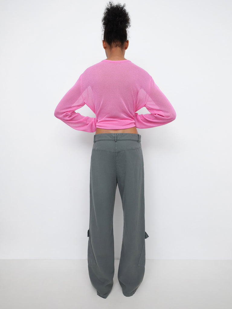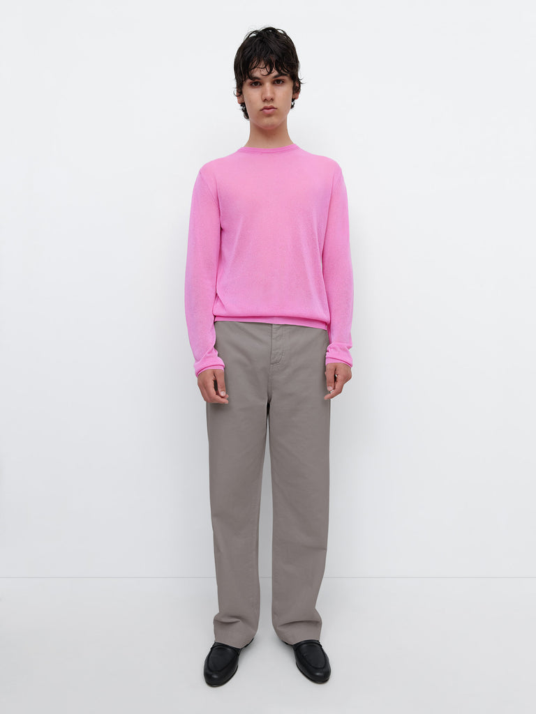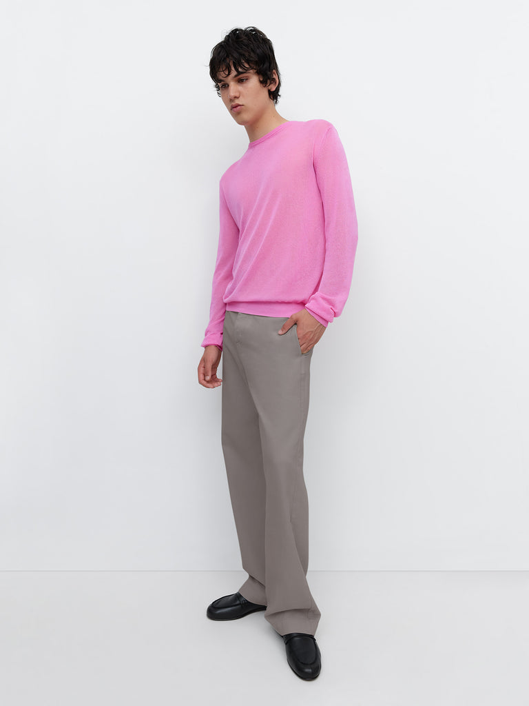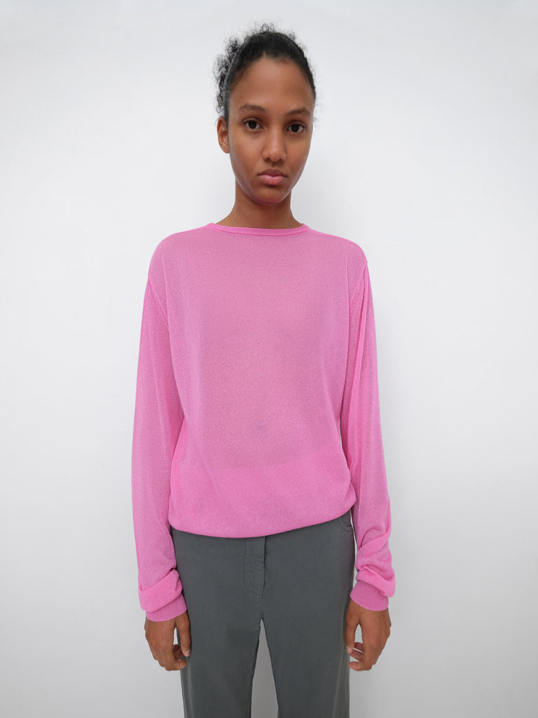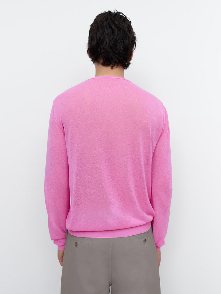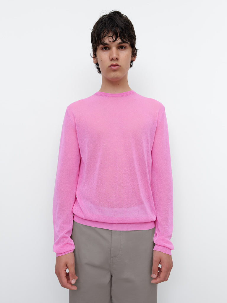 Pink fine-knit sweater with a slightly sheer finish. Designed for men and woman, with a ribbed crew neck, long sleeves, and a slim fit. Features ribbed cuffs and hem for a structured silhouette.