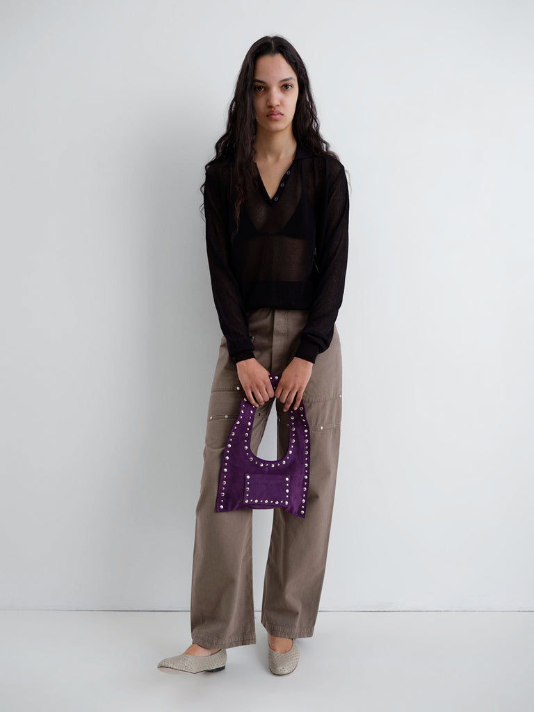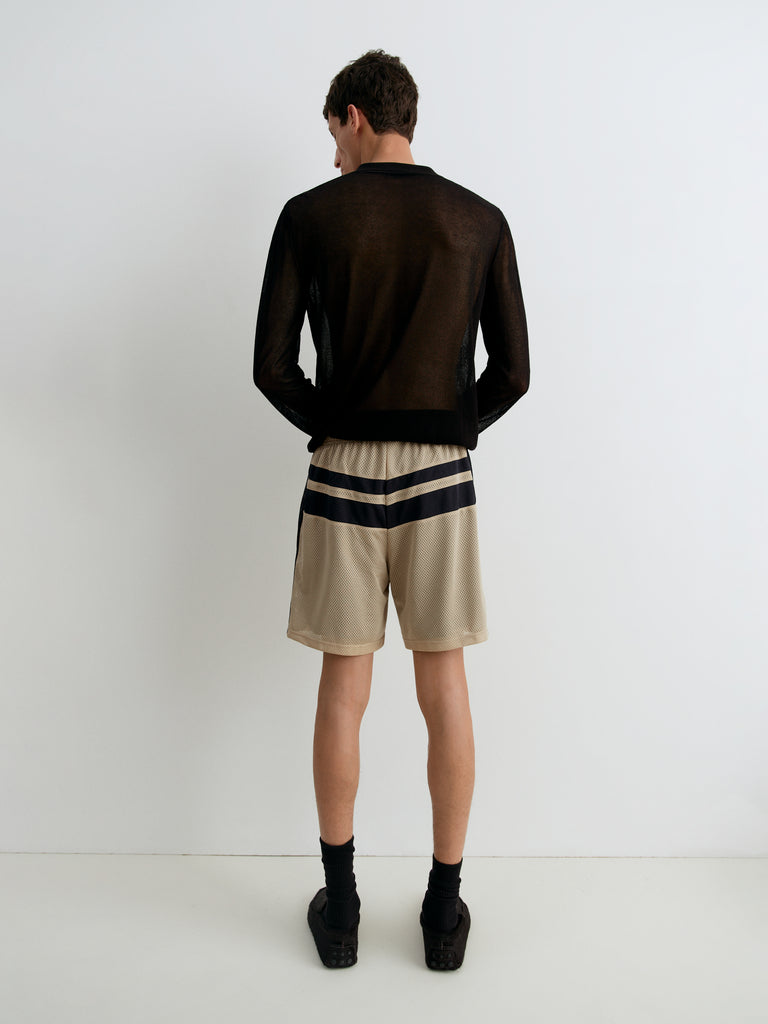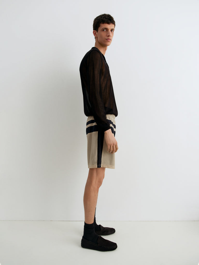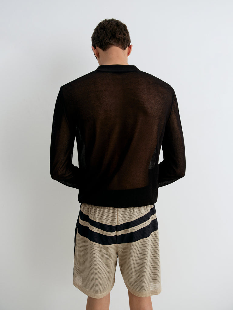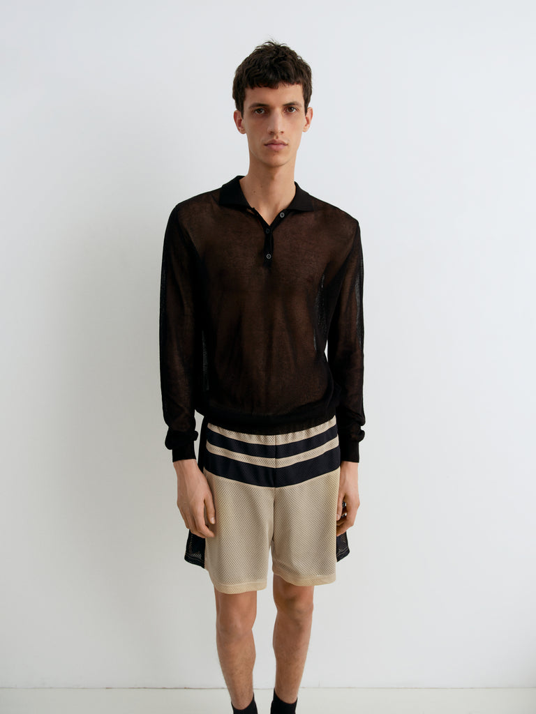 Black sheer knit polo. Perfect for women and men, crafted in lightweight fabric with a subtle transparent effect. Designed with a slightly fitted silhouette, featuring a tonal ribbed polo collar, buttoned placket and long sleeves with fitted cuffs.