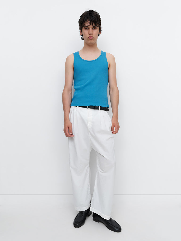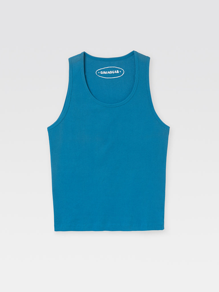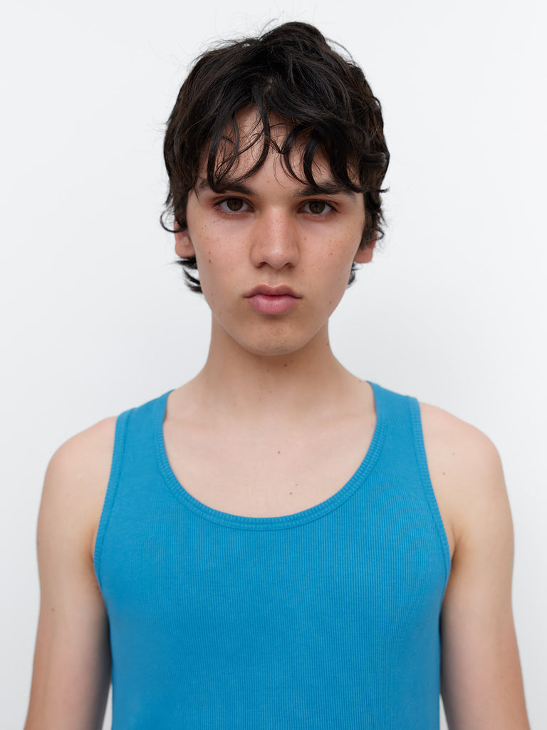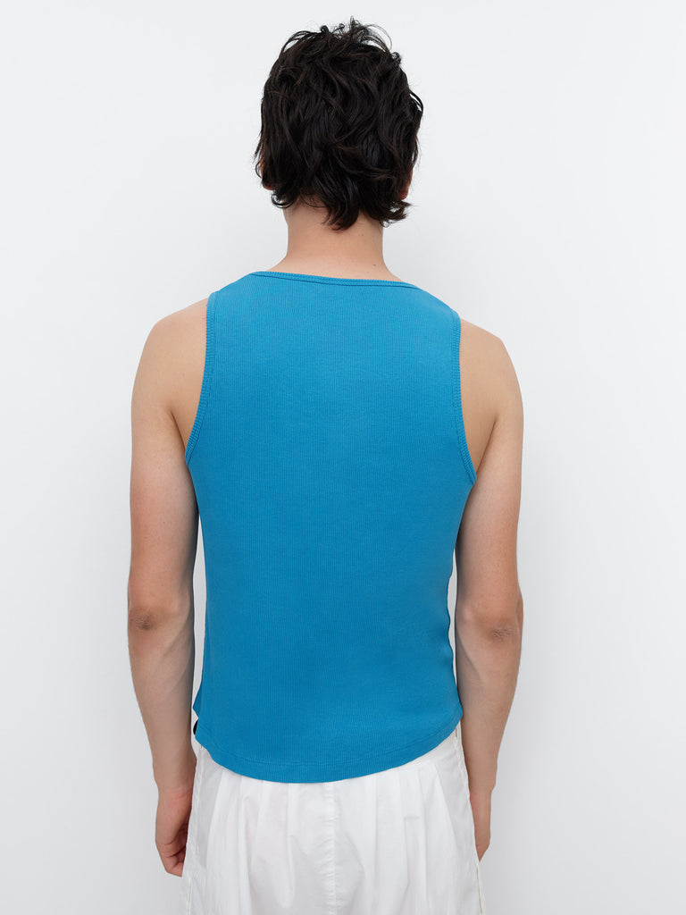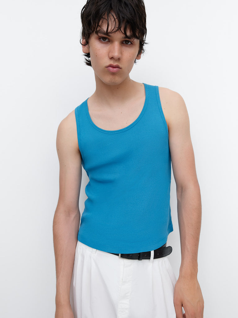 Blue men’s ribbed tank top in solid blue. Designed with a scoop neckline and wide straps for a fitted silhouette. Finished with matching fabric trim at the neck and armholes.