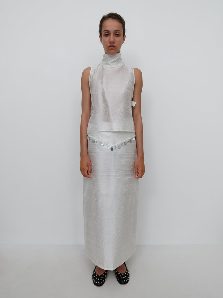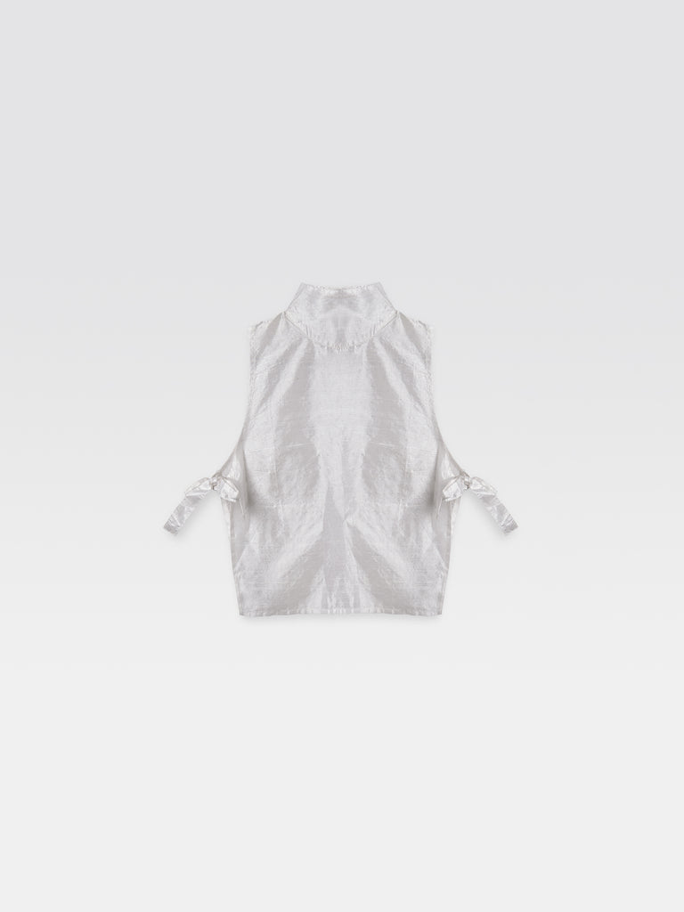 White women's top in textured wild silk. Sleeveless with a high halter neckline and side ties. Features a keyhole back and straight fit with tonal loop-button closure.