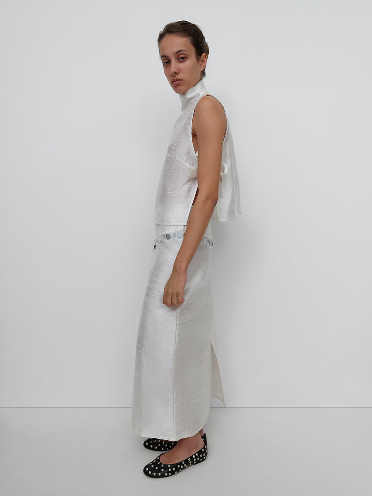 White women's top in textured wild silk. Sleeveless with a high halter neckline and side ties. Features a keyhole back and straight fit with tonal loop-button closure.*This garment is made from wild silk, a natural fiber known for its rich texture and subtle irregularities. Variations, slubs, and visible thread marks are part of its nature
