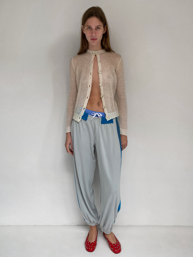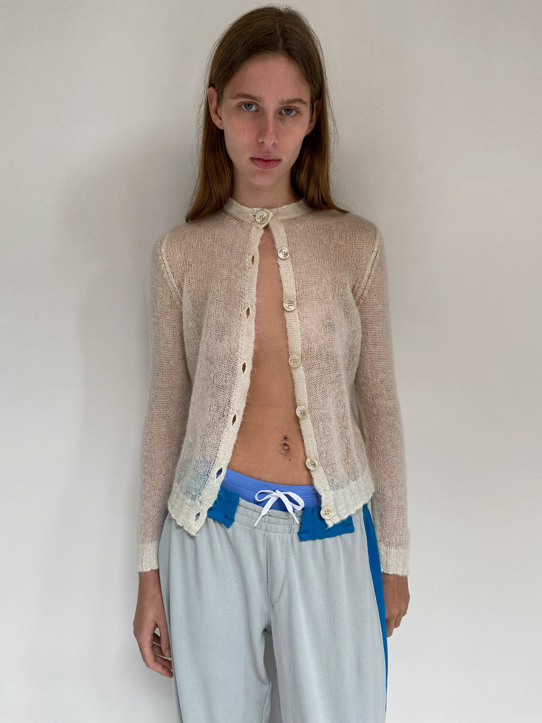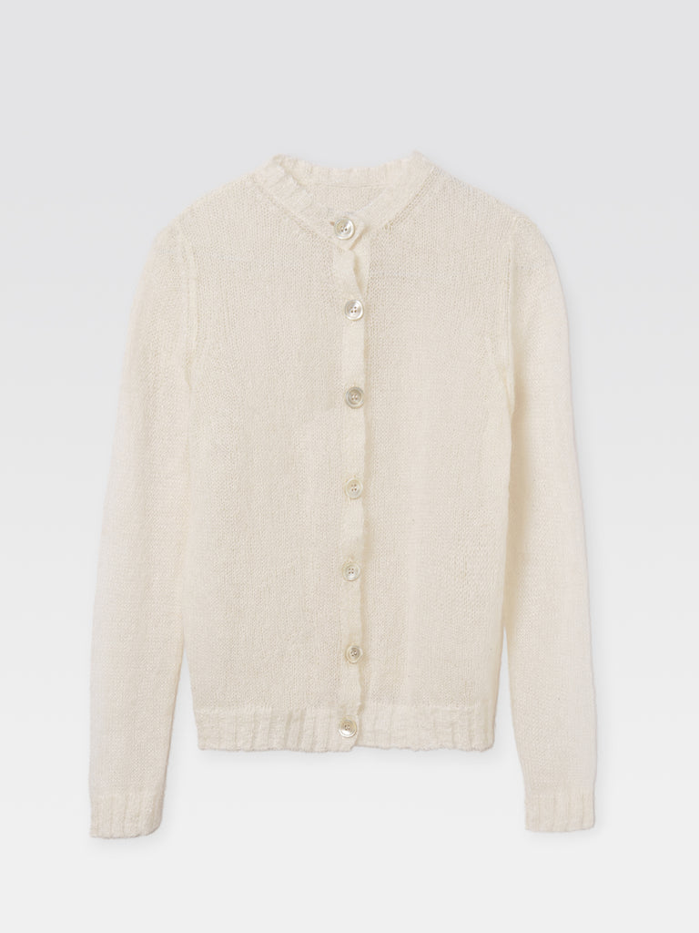 White women's mohair knit cardigan with a soft texture, featuring a round neckline, long sleeves, and tonal button fastening down the front. Finished with ribbed trims at the hem, neckline, and cuffs.