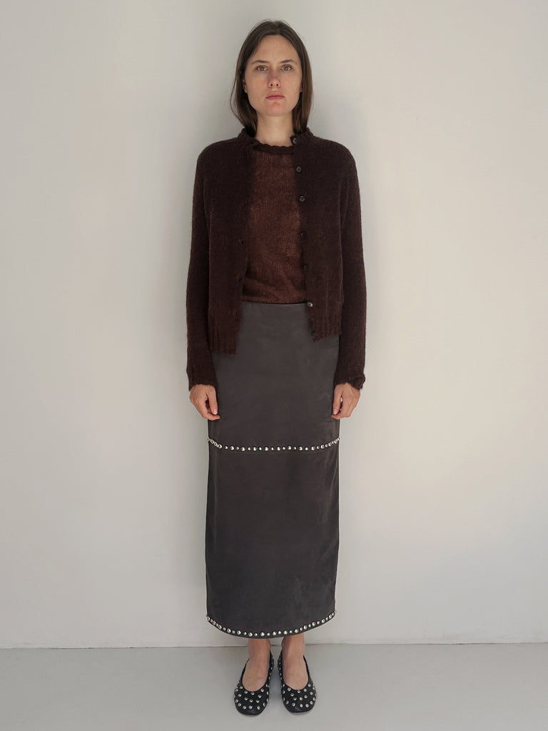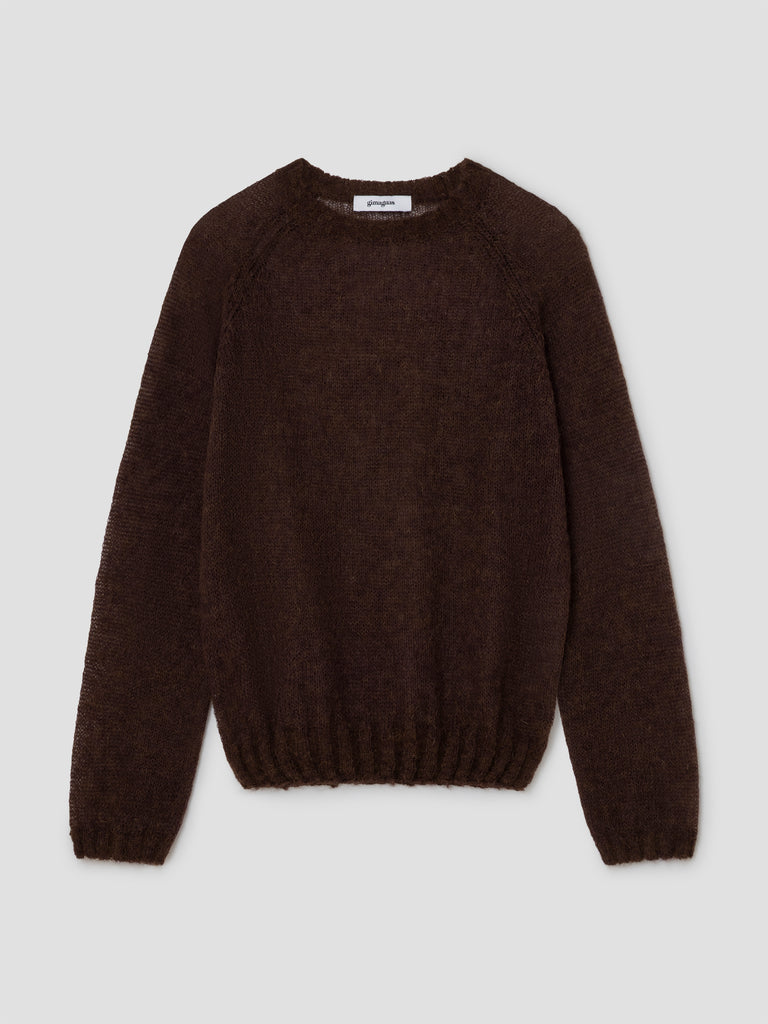 Brown women's mohair knit sweater with a relaxed fit and raglan sleeves. Features a round neckline, long sleeves, and ribbed finishes at the cuffs, hem, and collar. Lightweight and with a soft texture.