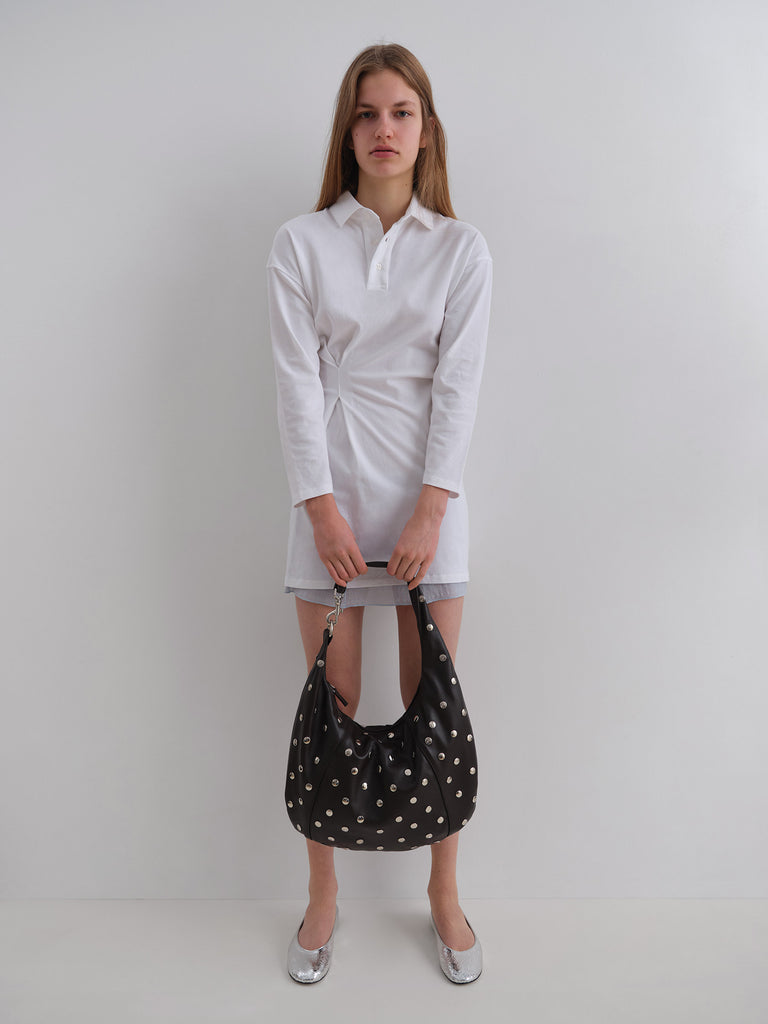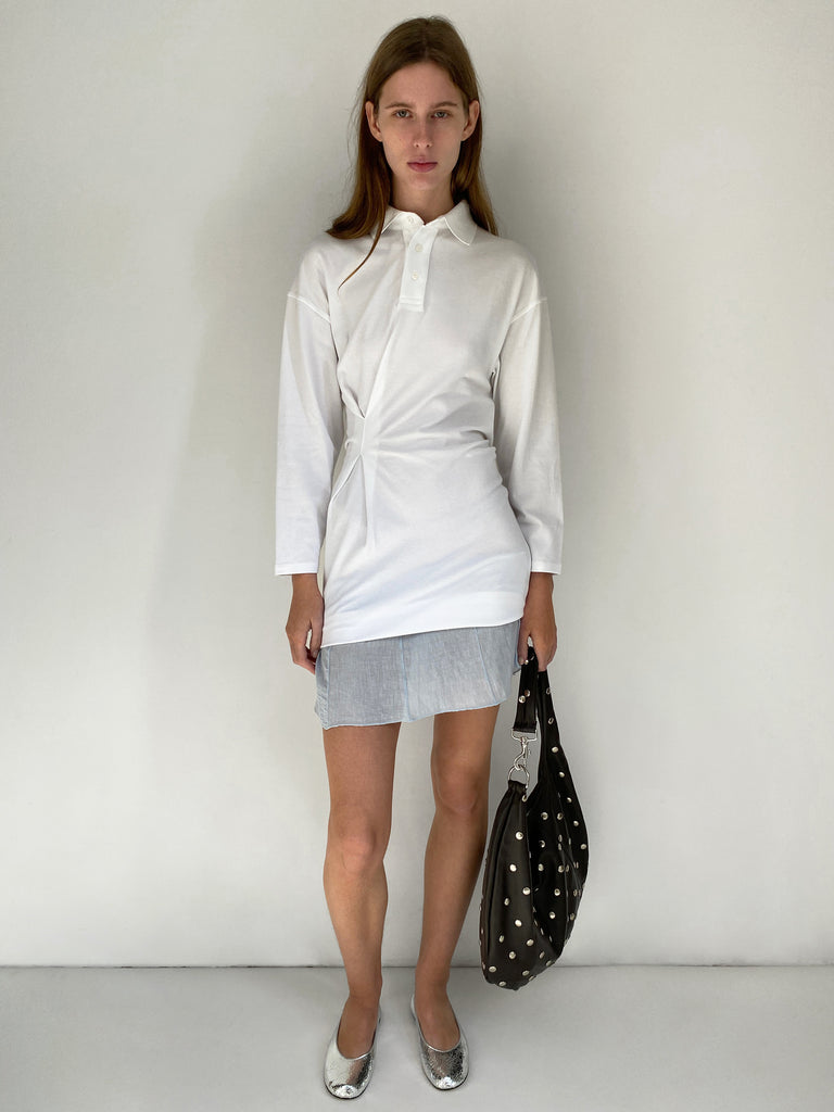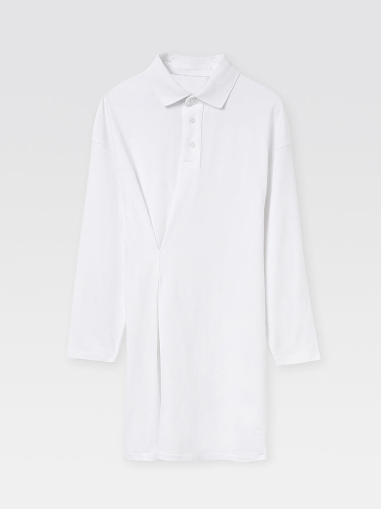 Short white piqué women's dress with a polo-style collar featuring a buttoned placket. Long sleeves with dropped shoulders for an oversized look in the upper body, contrasted by a cinched waist. Subtle front pleats add structure and movement.