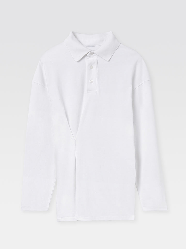 Short white women's piqué dress with a polo-style collar and buttoned placket.