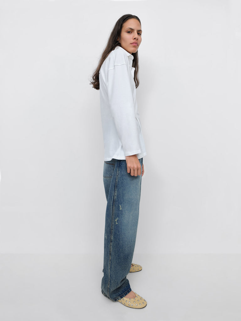 Designed with long sleeves and dropped shoulders for an oversized look in the upper body, balanced by a cinched waist. Subtle front pleats add structure and movement.