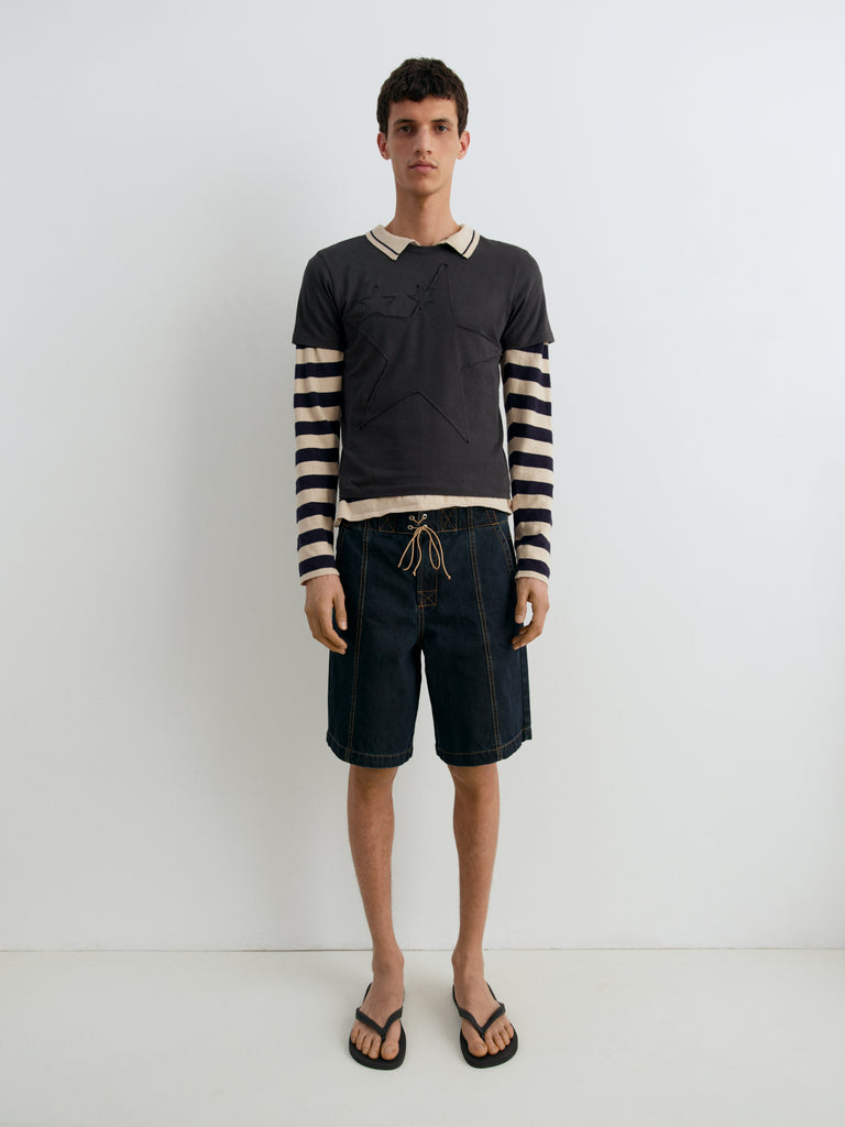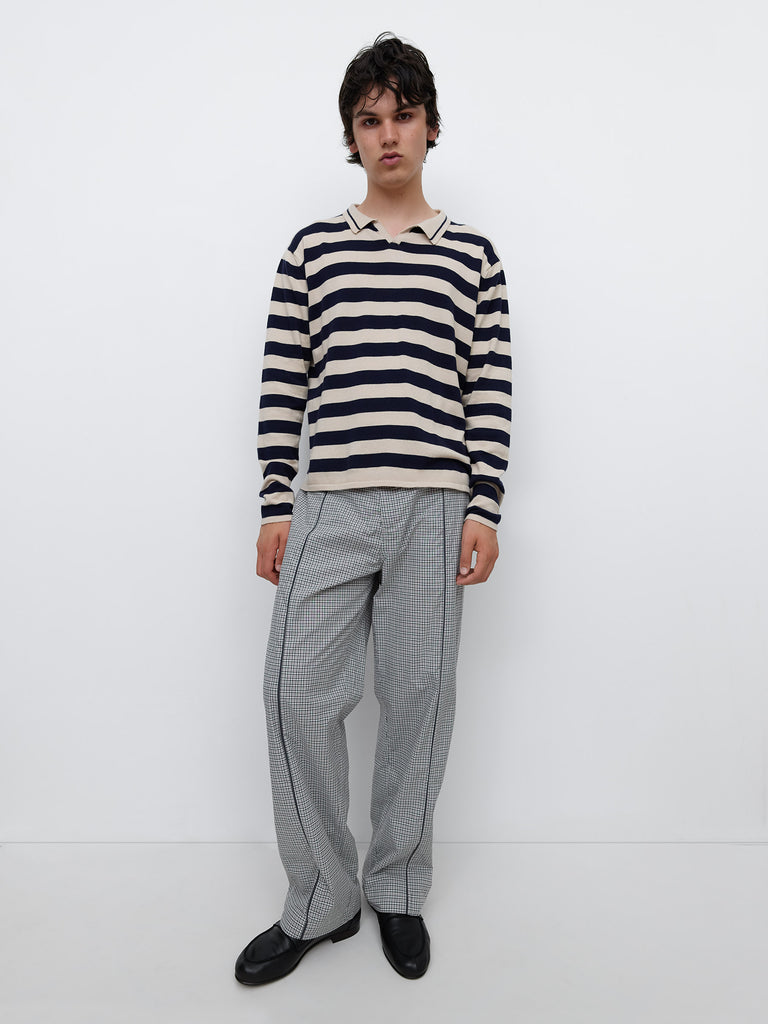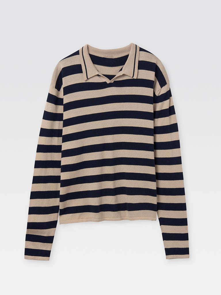 Striped knit polo. Designed in navy and beige with a straight fit, ribbed collar and long sleeves. Perfect for women and men, complete with a front opening and matching fabric trim.