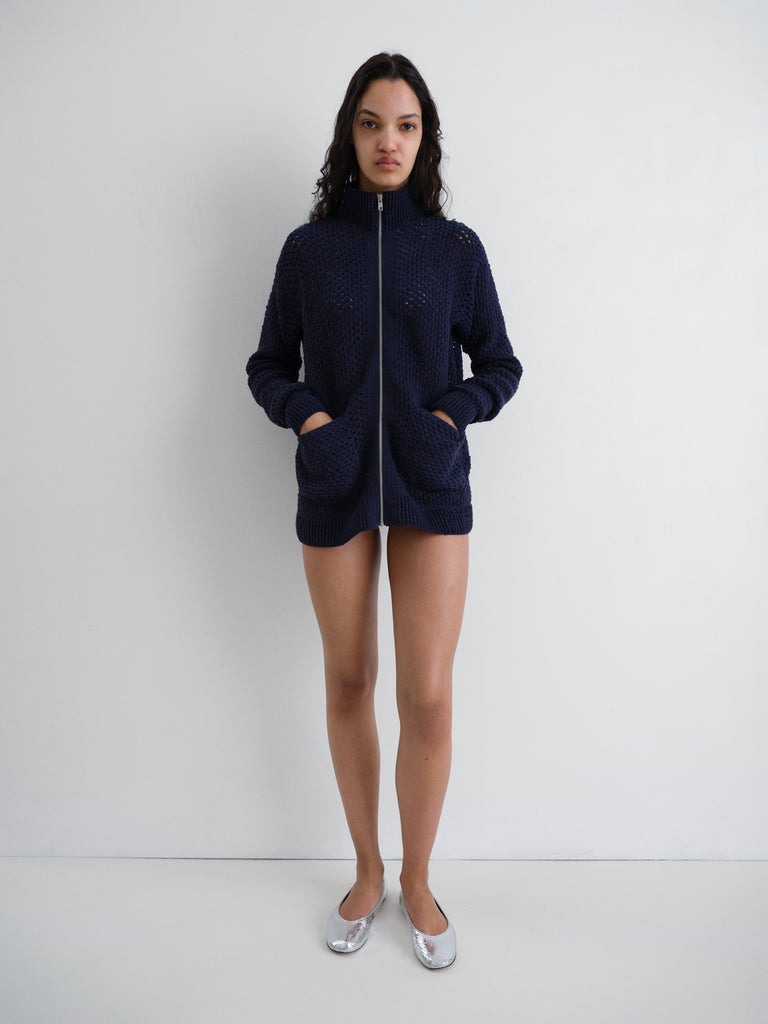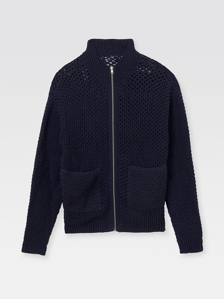 Crochet jacket handcrafted in navy cotton for a textured finish, perfect for women and men, featuring a ribbed round collar, front zip closure, and patch pockets in matching fabric.