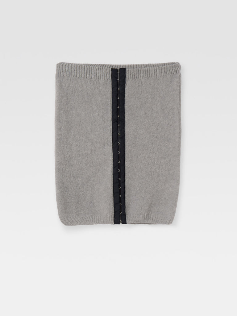 Knitted bandeau top in grey, fitted fit, closed with a contrast hook and eye strap on the front.