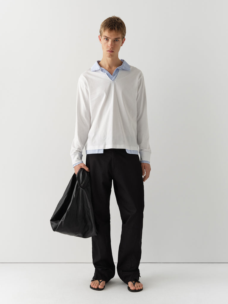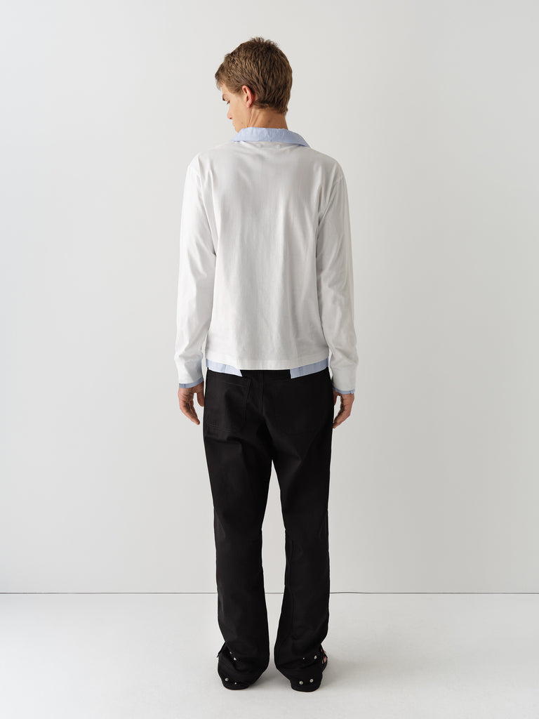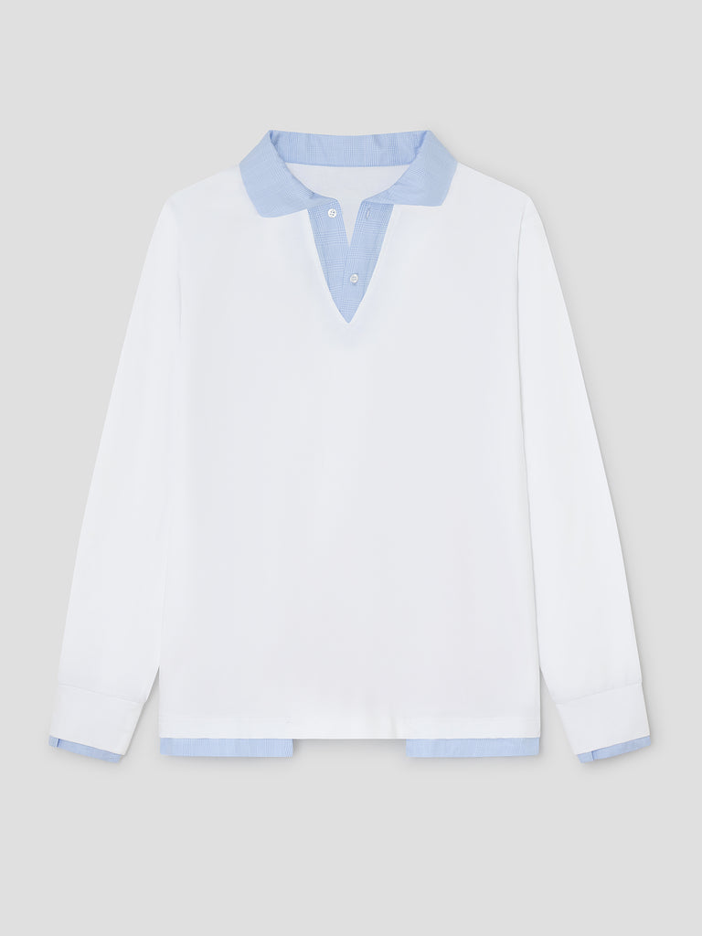 White and blue checkered polo shirt with faux layered effect.