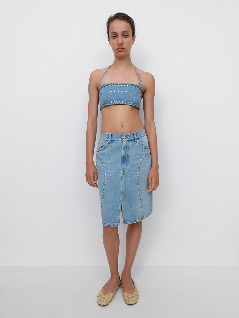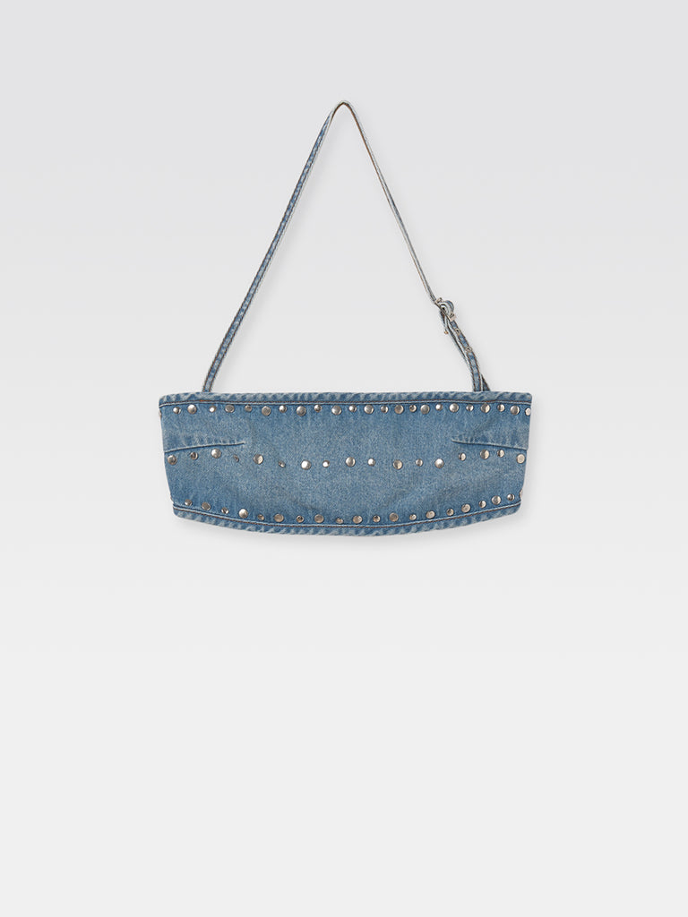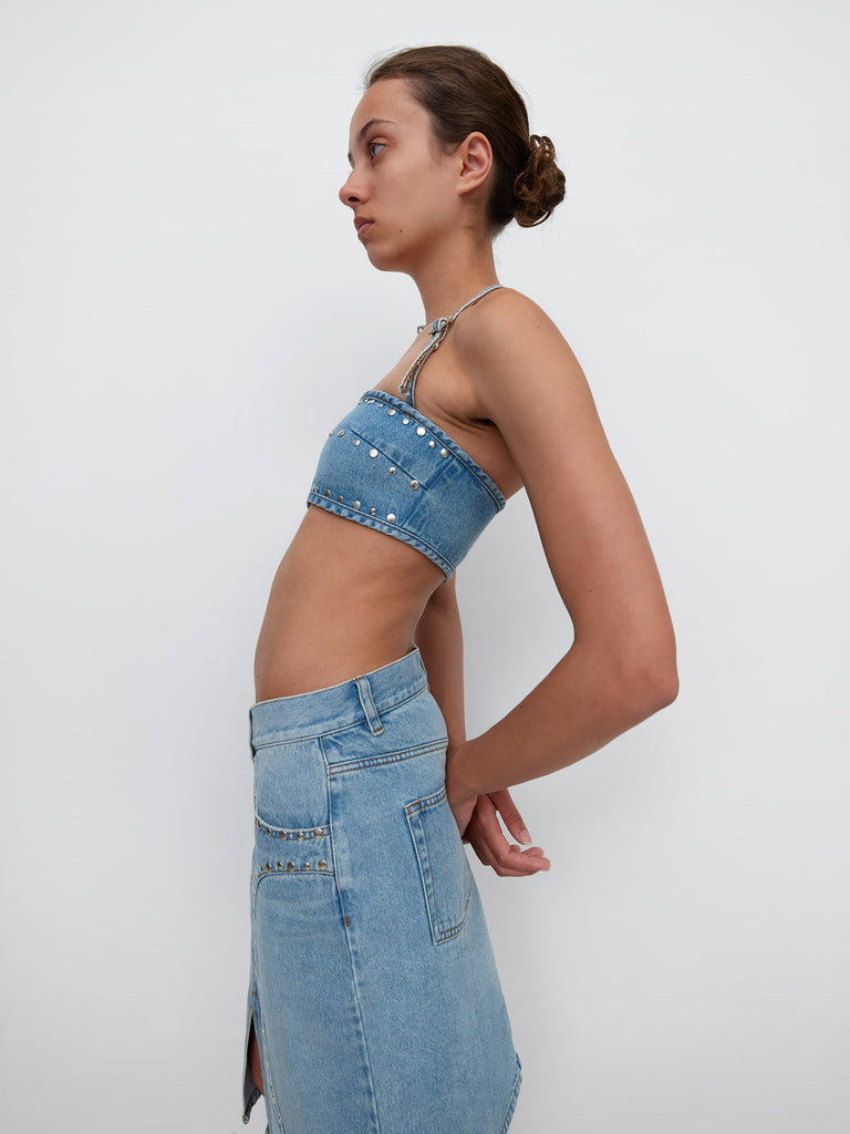 Women's bandeau top in washed blue denim. Designed with an adjustable matching fabric strap with a metal buckle. Detailed with horizontal metallic studs. Fastened at the back with metal hook closures.