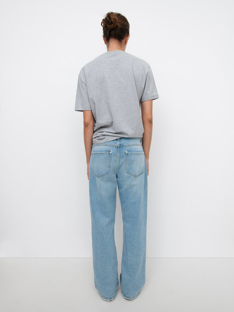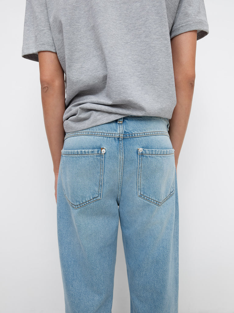 Women's straight-fit pants. Crafted in light-wash blue denim with studded knee details. Designed with curved front pockets and back patch pockets.