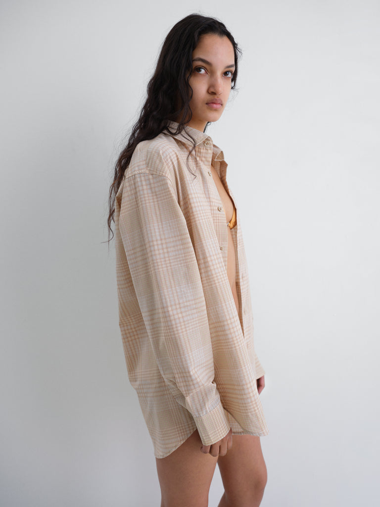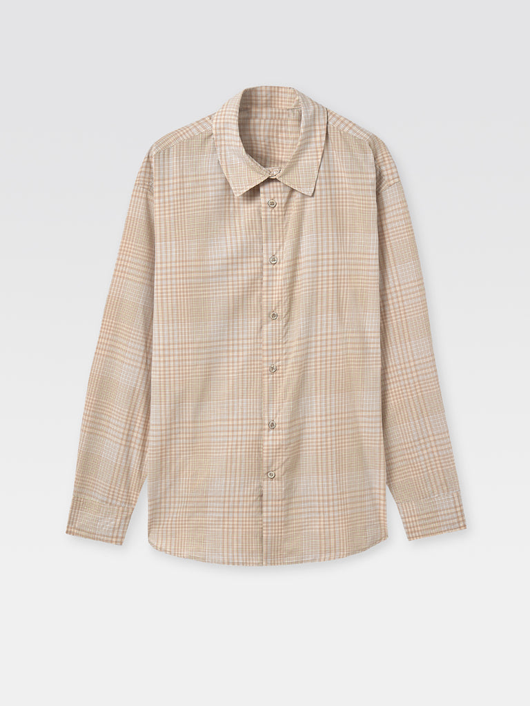 Brown oversized checkered shirt. Designed for women and men in lightweight fabric with a structured collar and front button placket. Features long sleeves with buttoned cuffs.