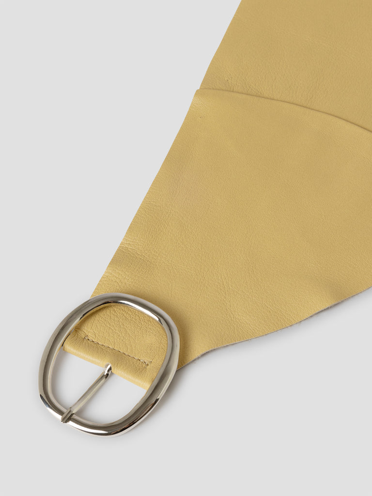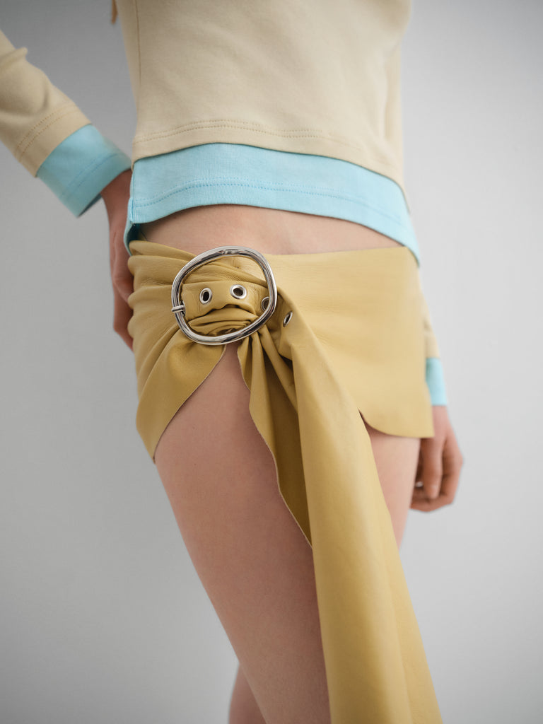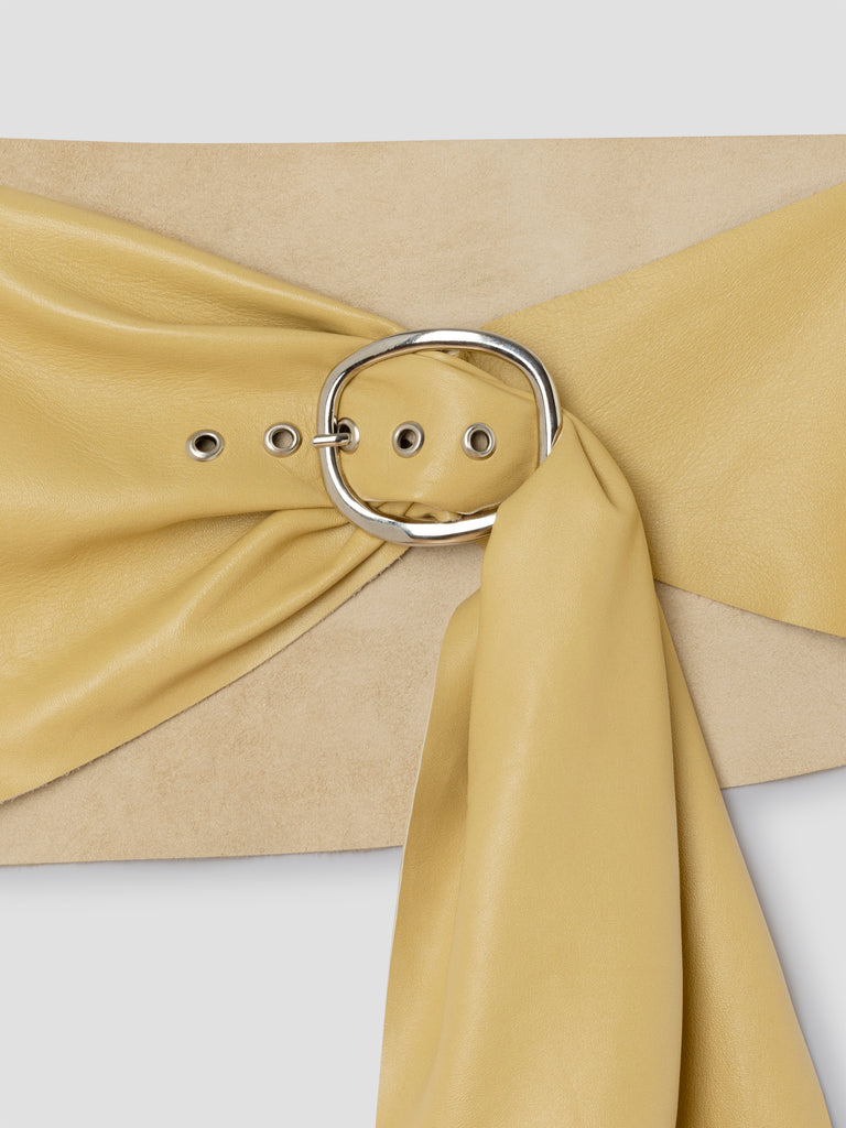Butter leather belt with draped multifunction design.