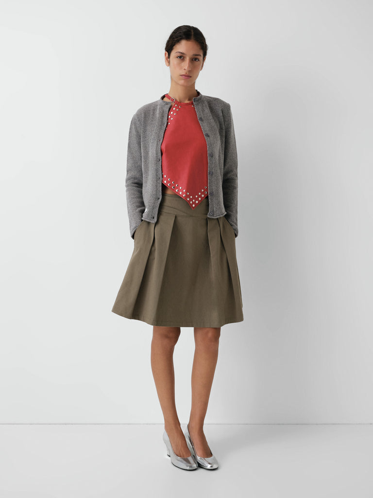 Light khaki A-line midi skirt with silver belt detail.