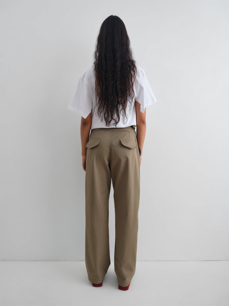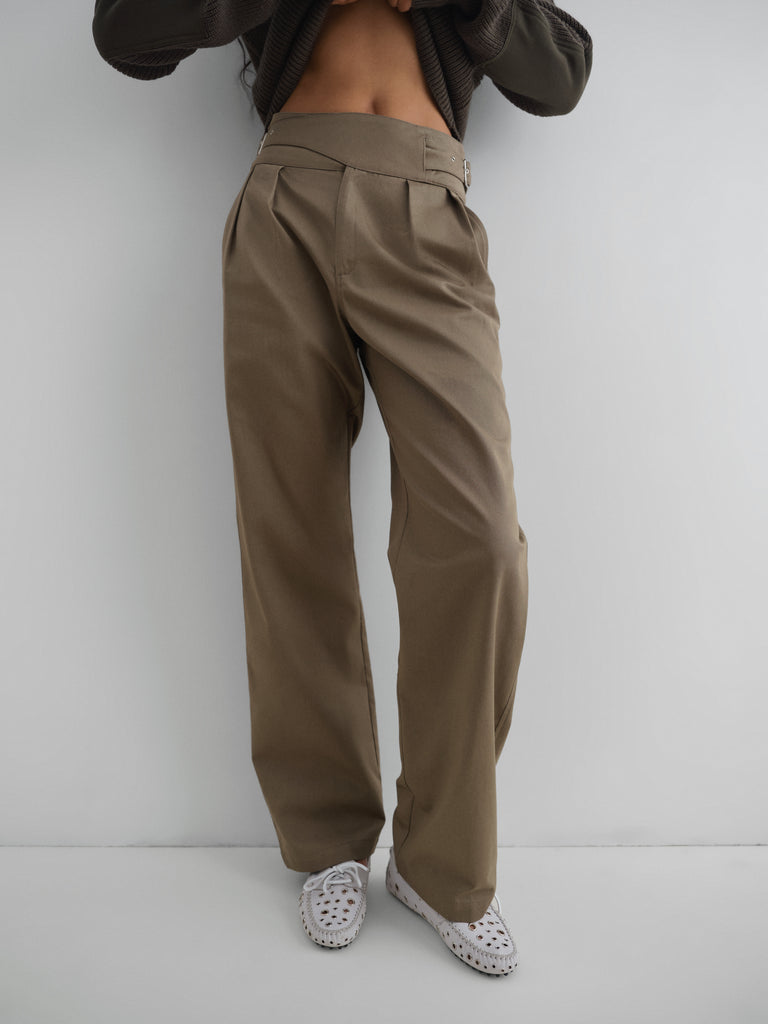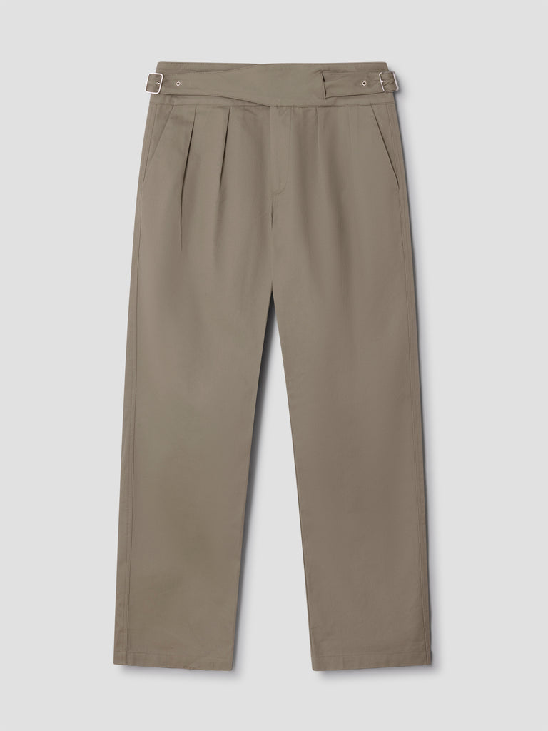 Light khaki trousers with built-in belt closure.