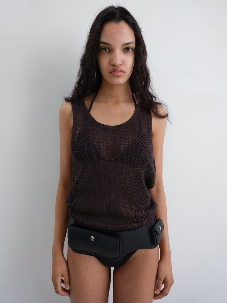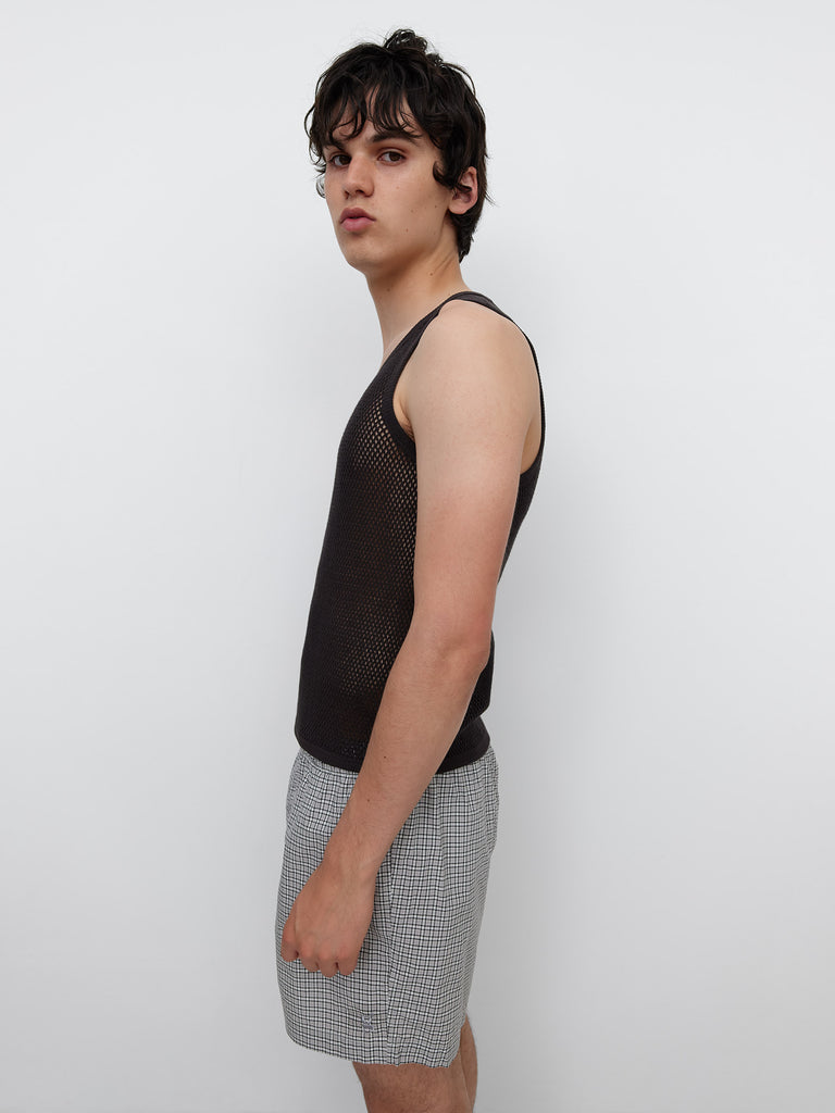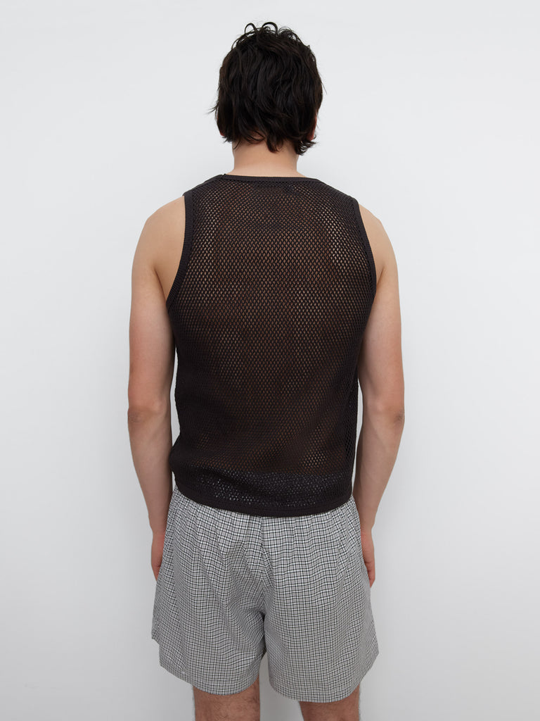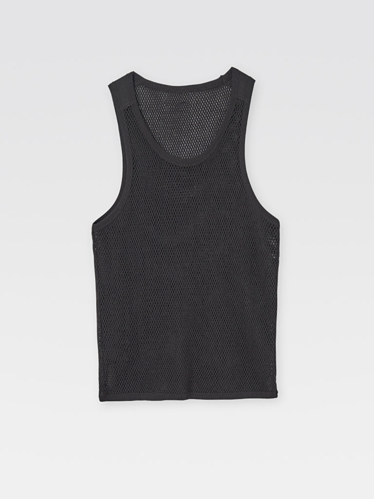 Black mesh tank top, perfect for women and men. Designed in breathable open-knit fabric with a straight fit. Features a deep scoop neckline, sleeveless cut and contrast trim along the edges.