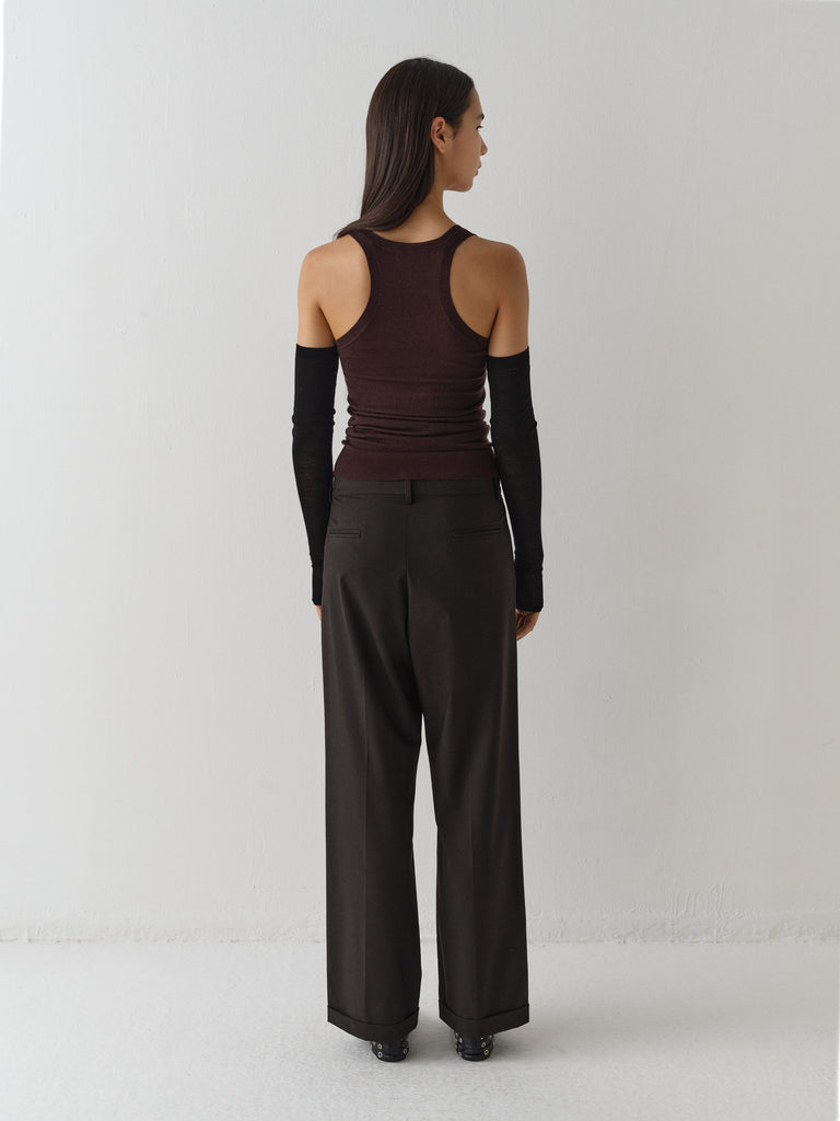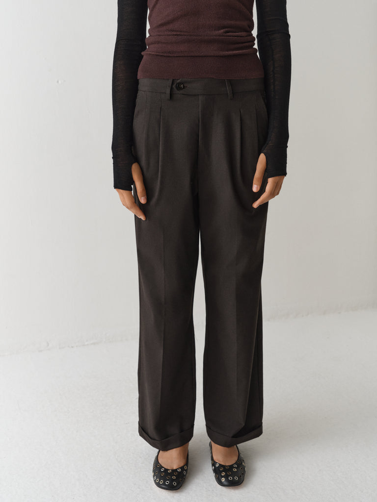 Brown sartorial trousers with tonal fabric belt detail.
