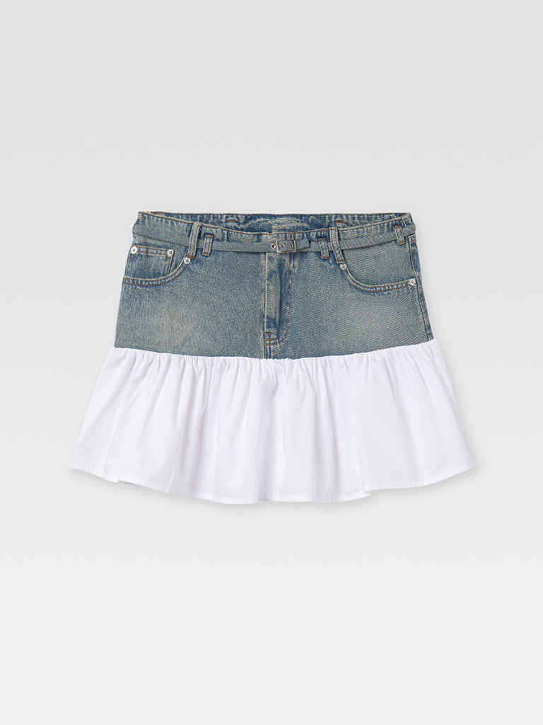 Denim and poplin women's skirt. The upper section features denim-style pockets and a classic button-up fly with a metal zip. Designed with a matching fabric belt and a metal buckle. The contrasting lower section is crafted from ruched white poplin.