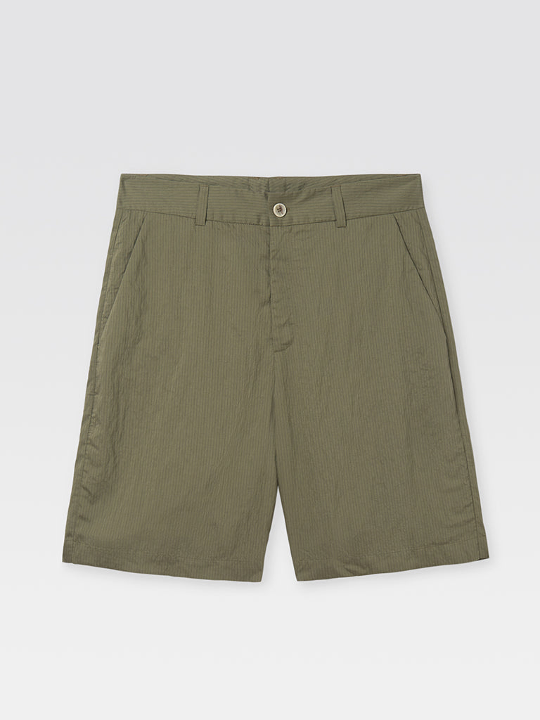 Green striped shorts in technical fabric. Knee-length design with a regular fit, perfect for woman and men. Features a matching fabric waistband, zip and button closure, and slanted side pockets.