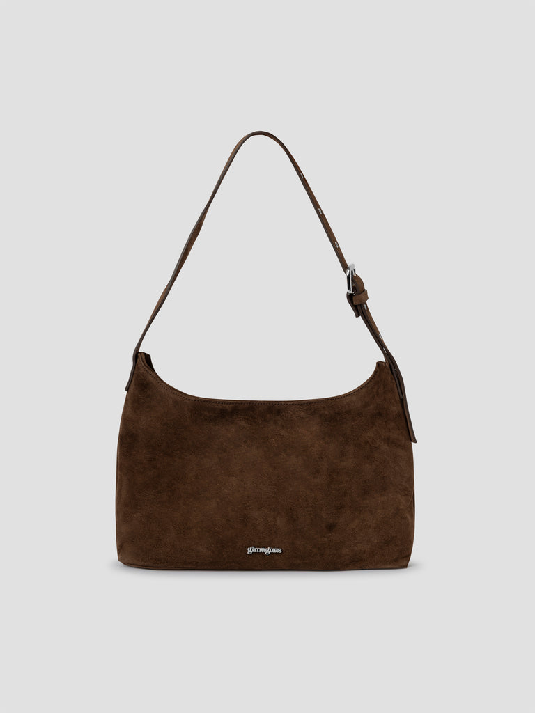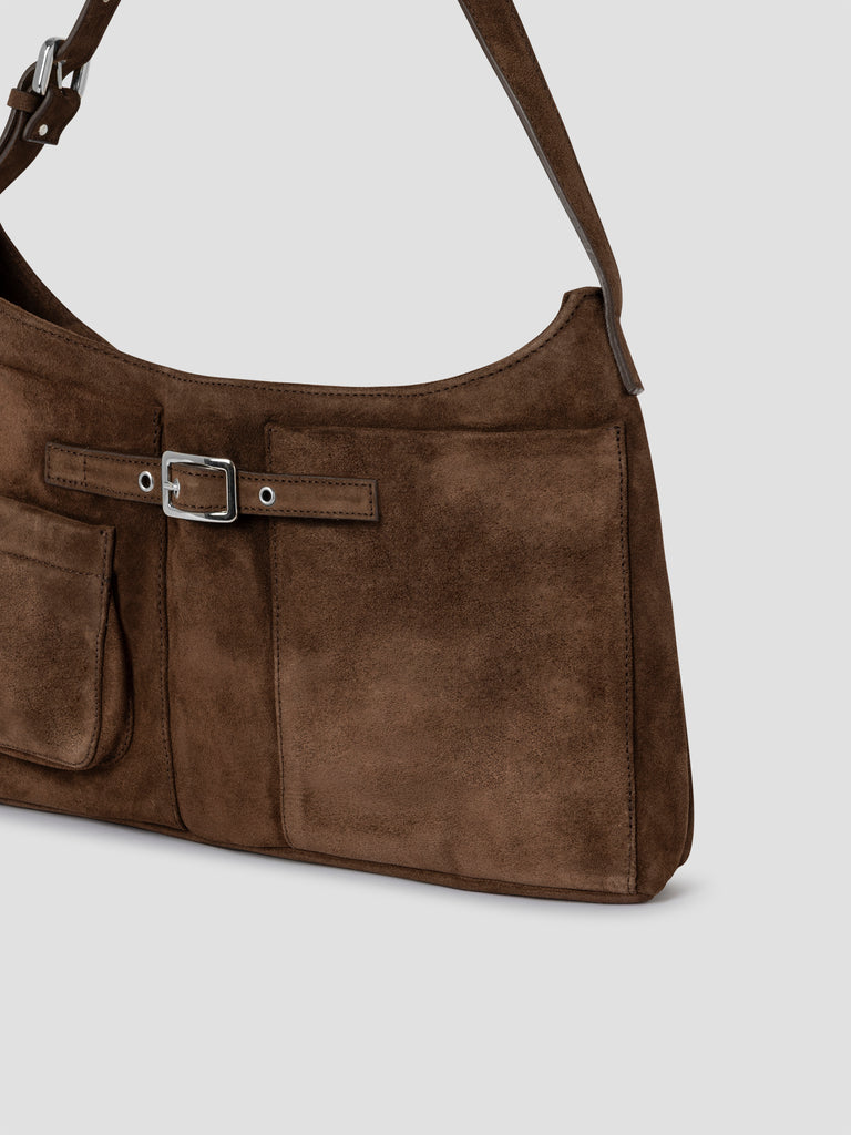 Brown suede leather women's shoulder bag featuring an adjustable strap with a metallic buckle.