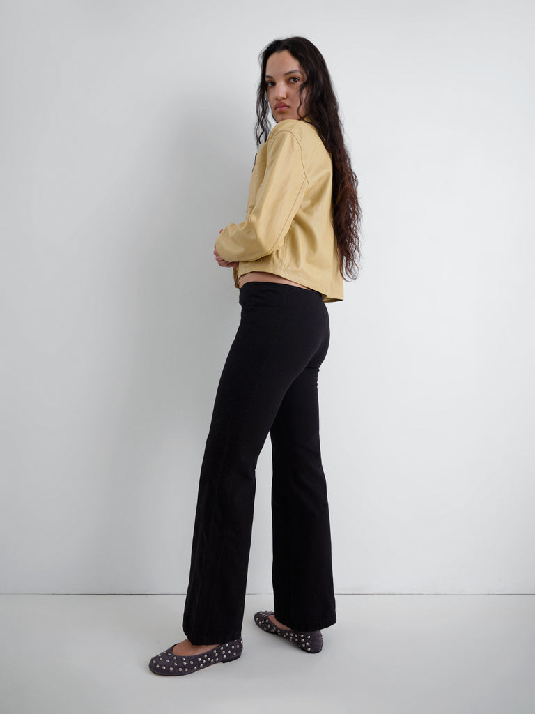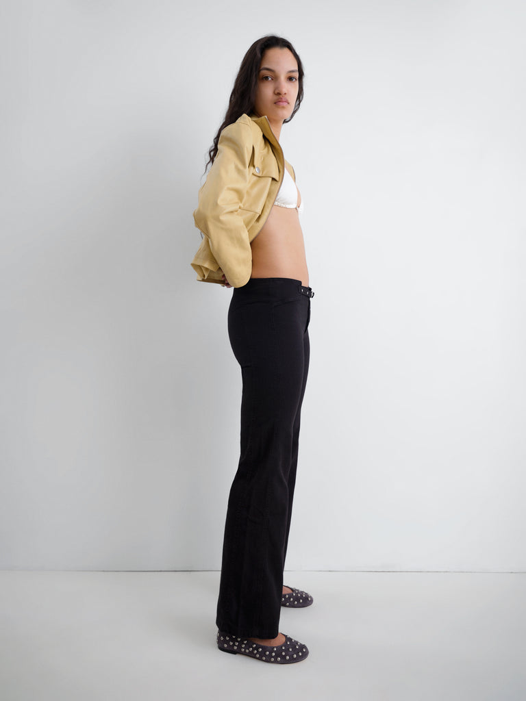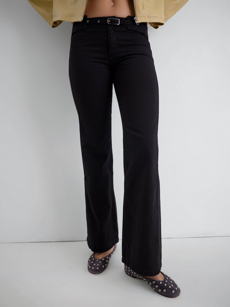 Mid-rise black denim jeans with a flared silhouette and a tailored waistband. Features a matching fabric belt with a metallic buckle, tonal stitching, and slightly flared hem. Made from deep black denim for a sleek look.
