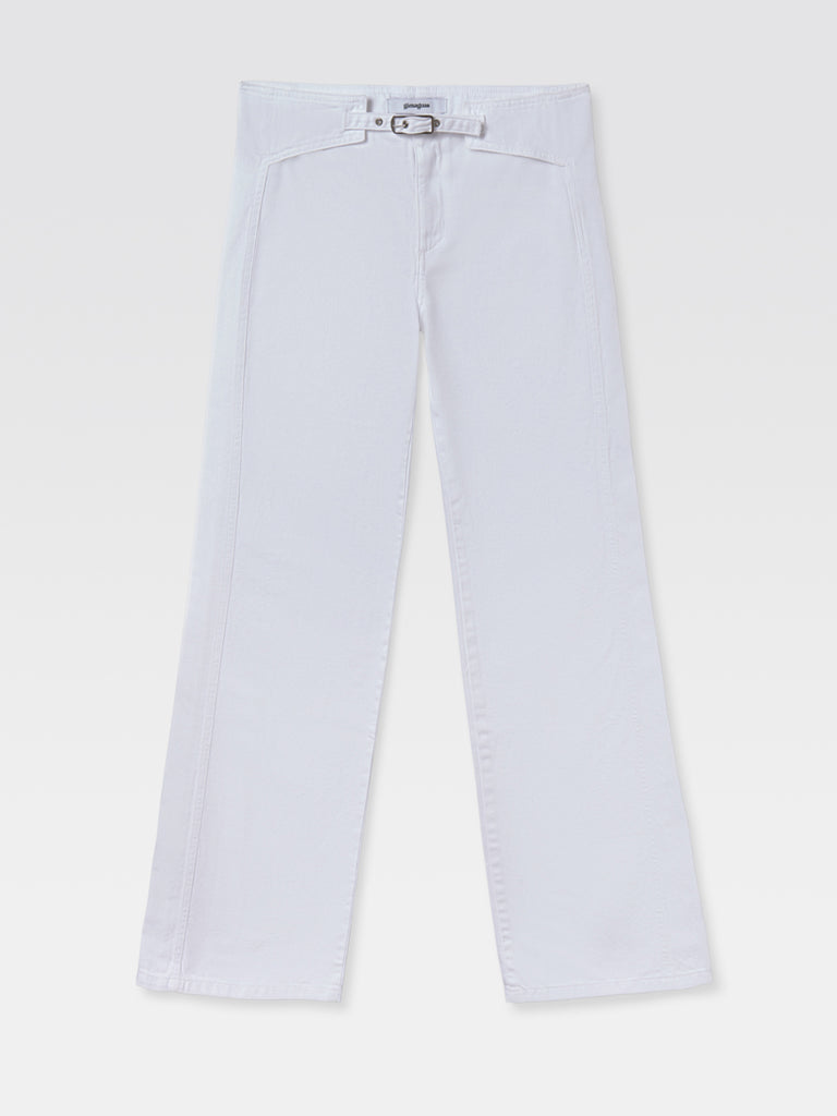 Mid-rise white denim jeans with a flared silhouette and a tailored waistband. Features a matching fabric belt with a metallic buckle, tonal stitching, and slightly flared hem. Made from crisp white denim for a minimalist finish.