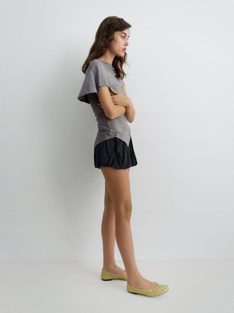 Black women's draped mini shorts in fluid knit. Voluminous silhouette with gathered detailing along the hips. Elasticated waistband with crescent-cut side pockets.