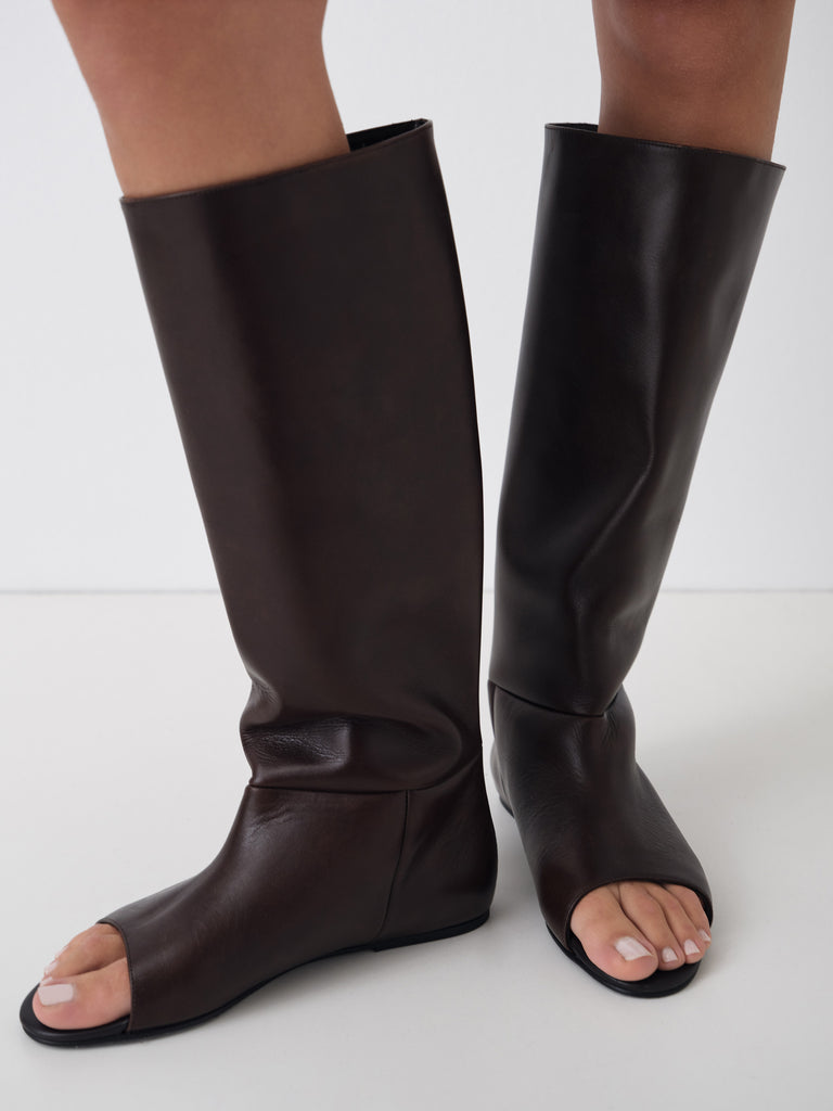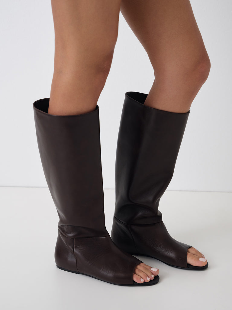 Brown leather open-toe boots with low heel.