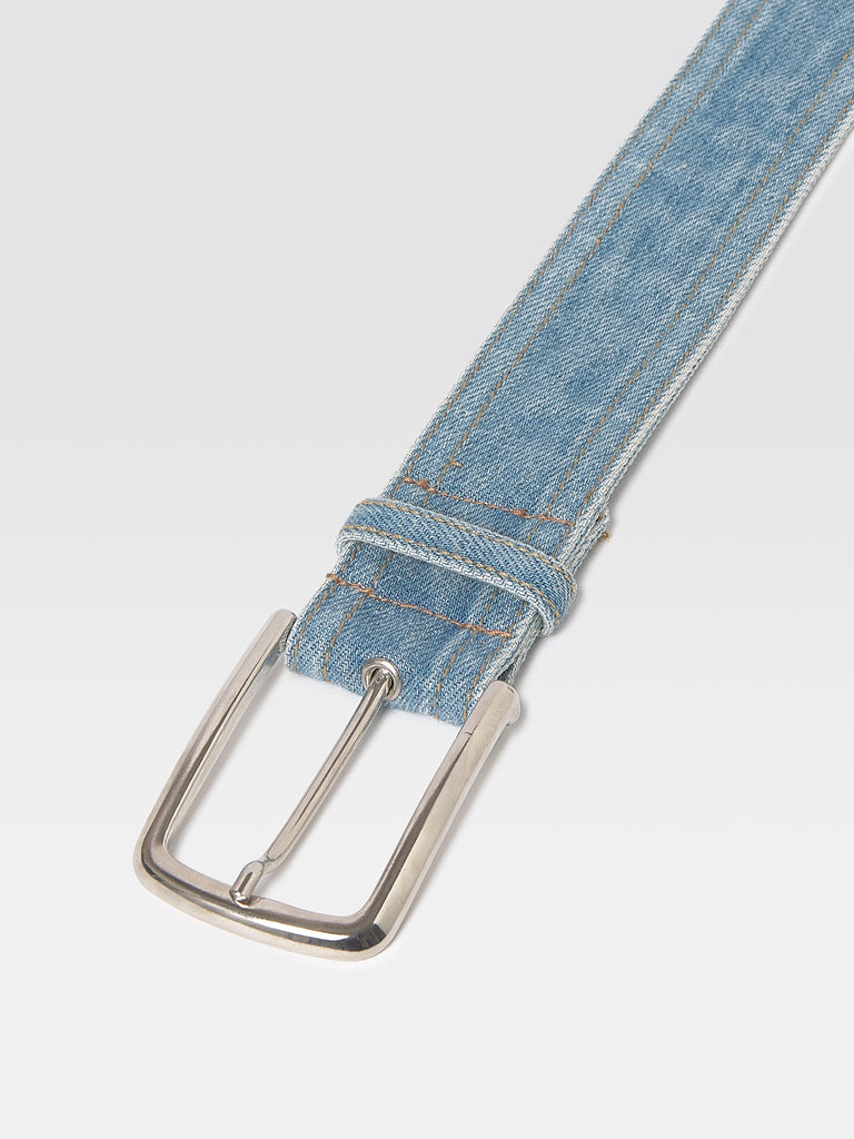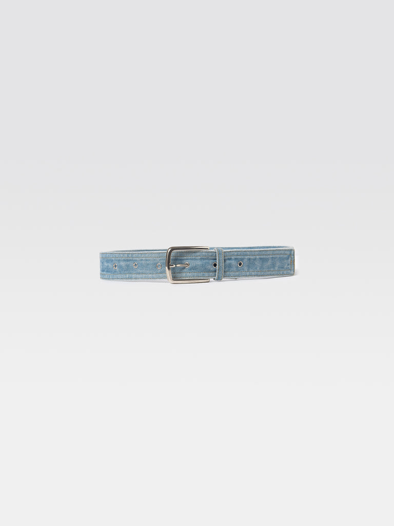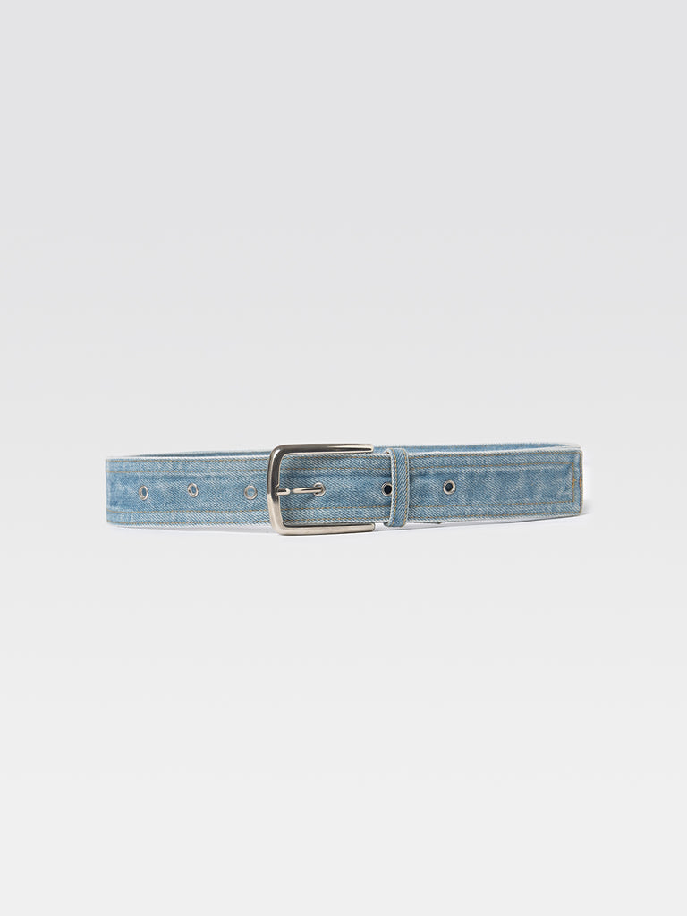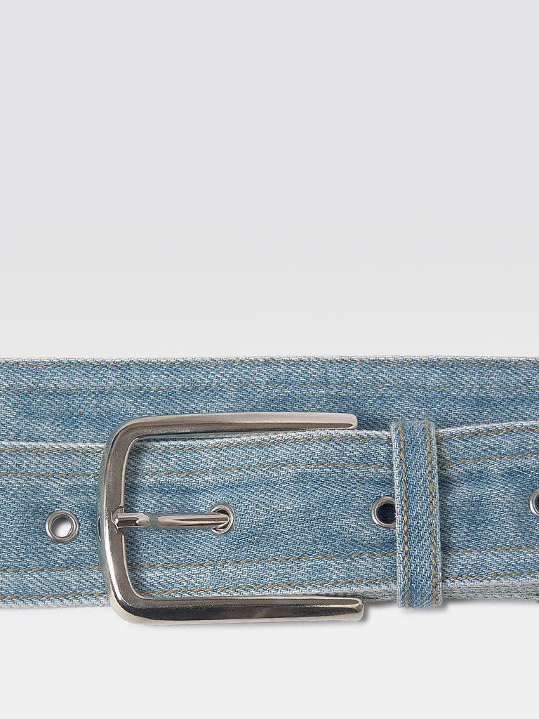 Blue light-wash denim belt. Designed with a silver-tone metal buckle and reinforced metallic eyelets. Features a structured silhouette with a washed finish, perfect for women and men.
