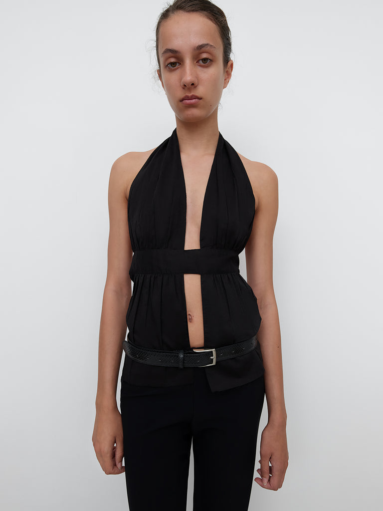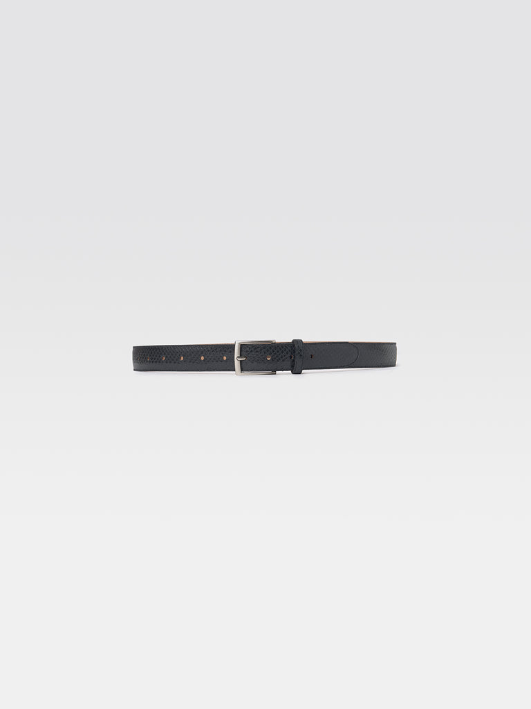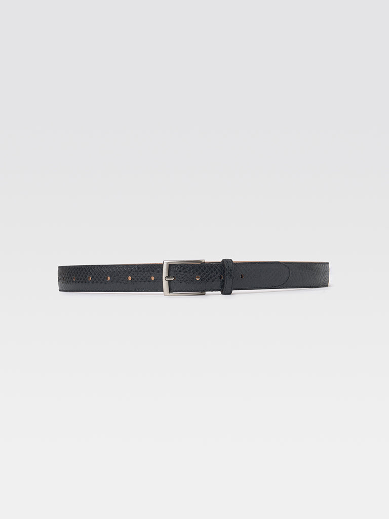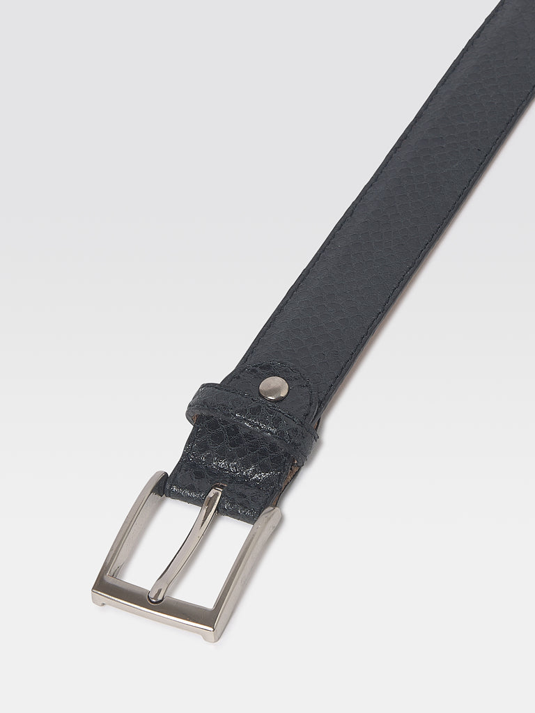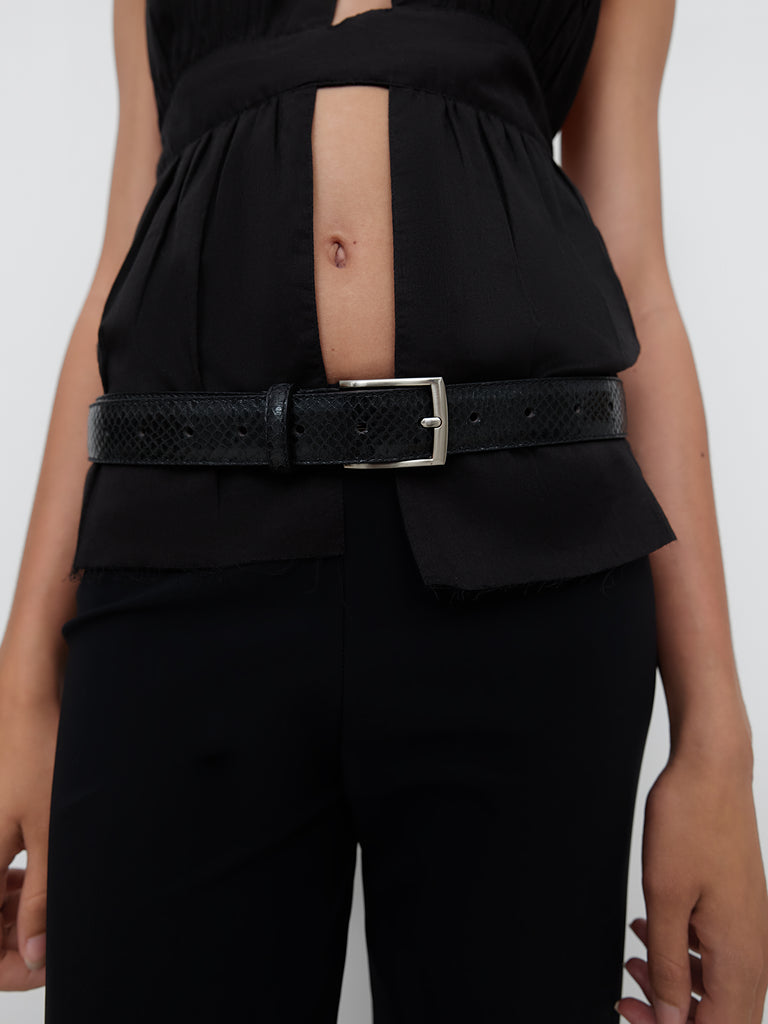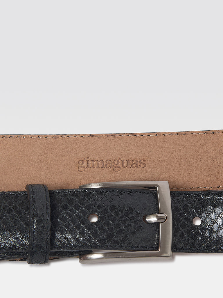 Black leather belt with a snake-effect texture. Designed for both women and men, featuring a silver-tone metal buckle and a beige leather-lined interior.
