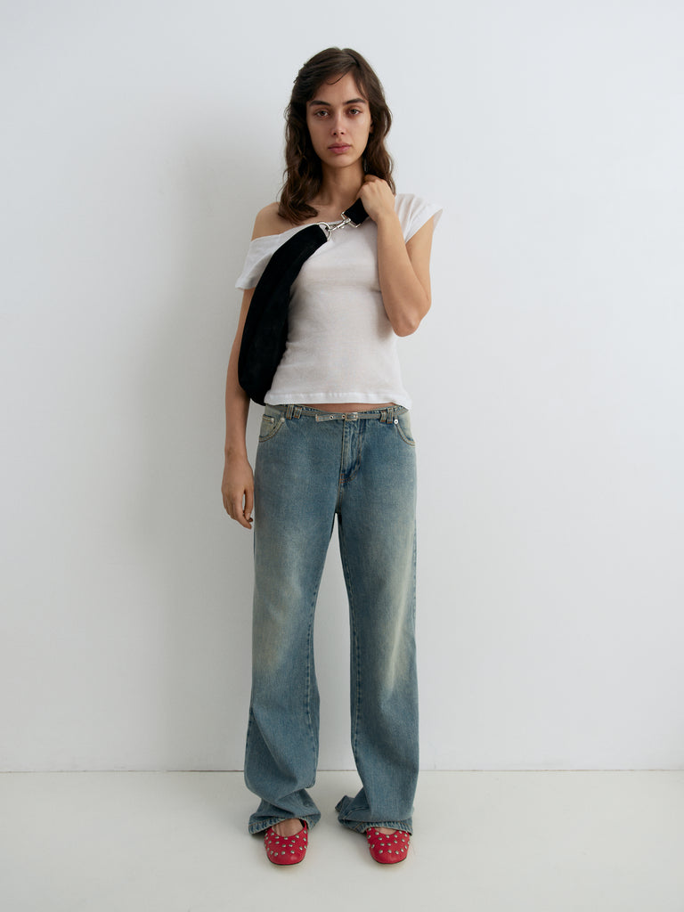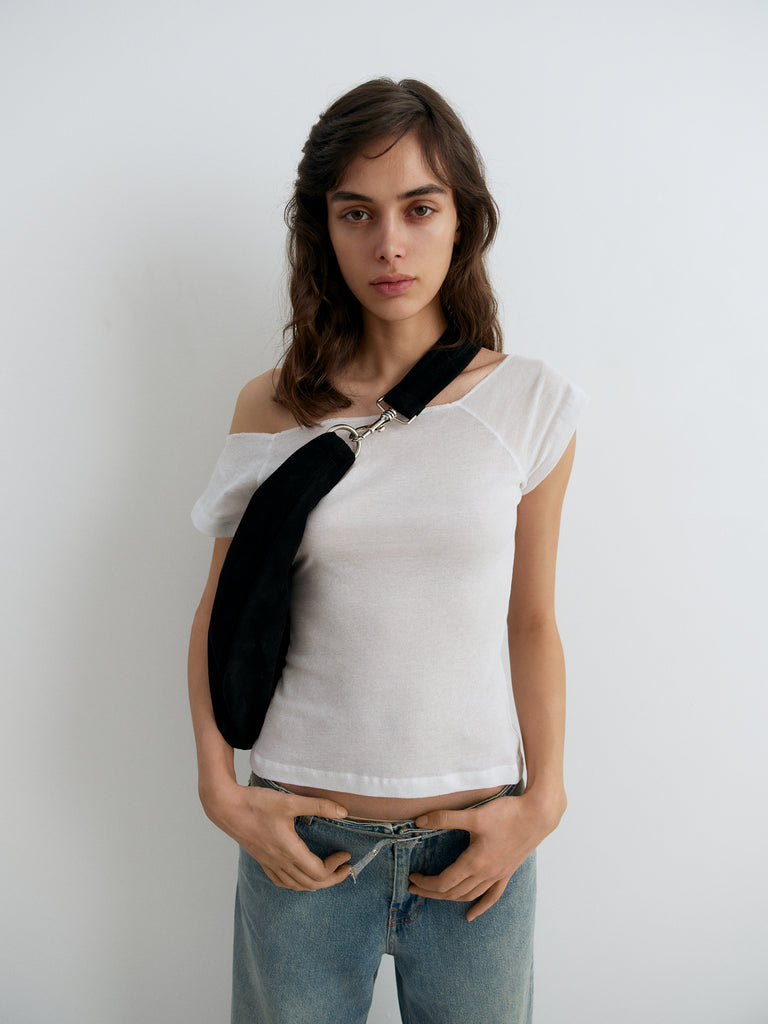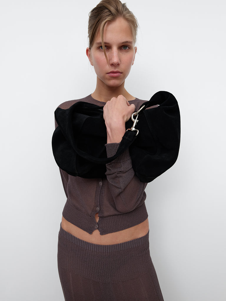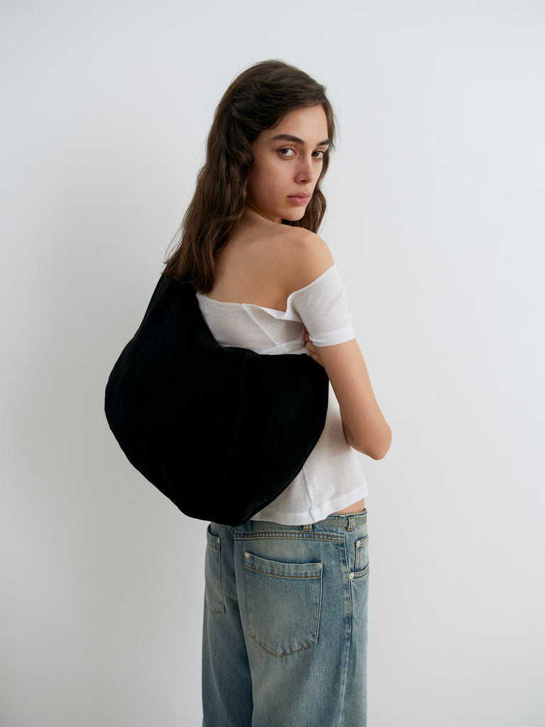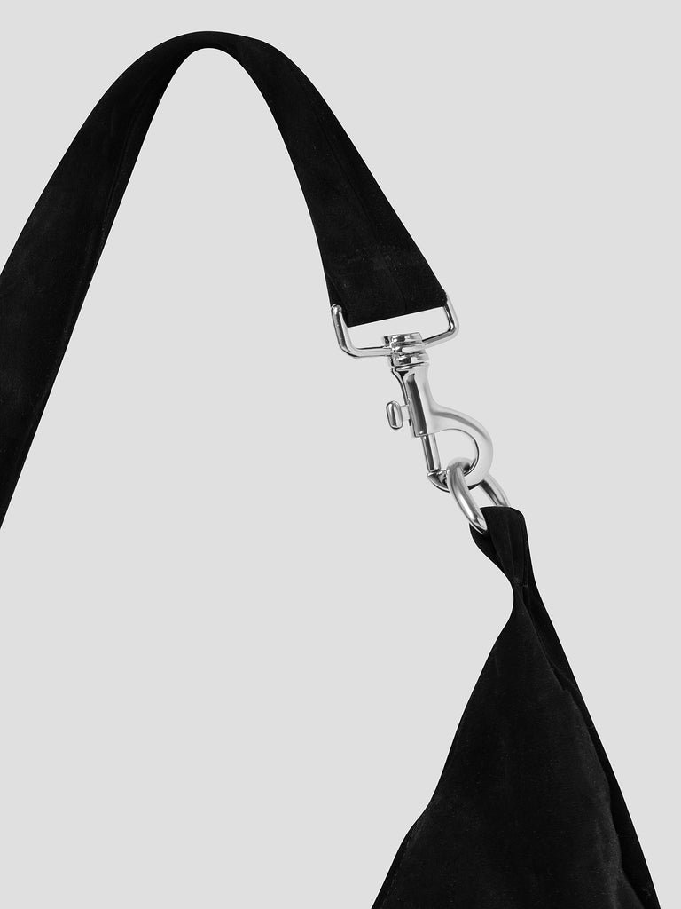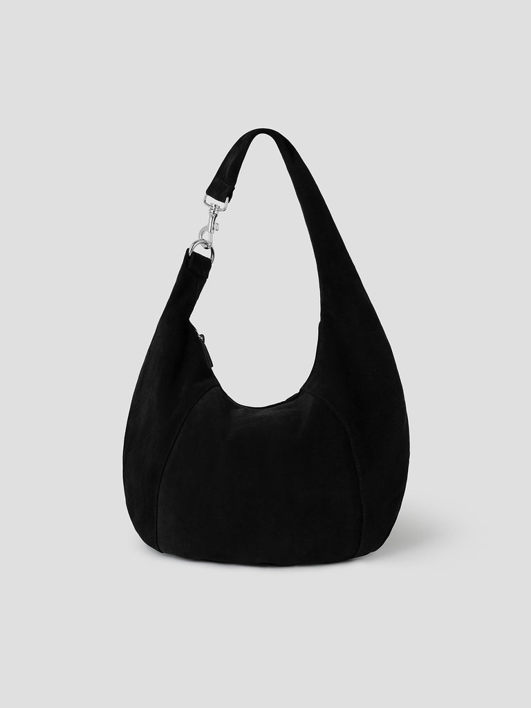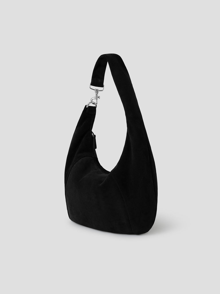 Black suede shoulder women's bag with a soft texture and curved silhouette.
