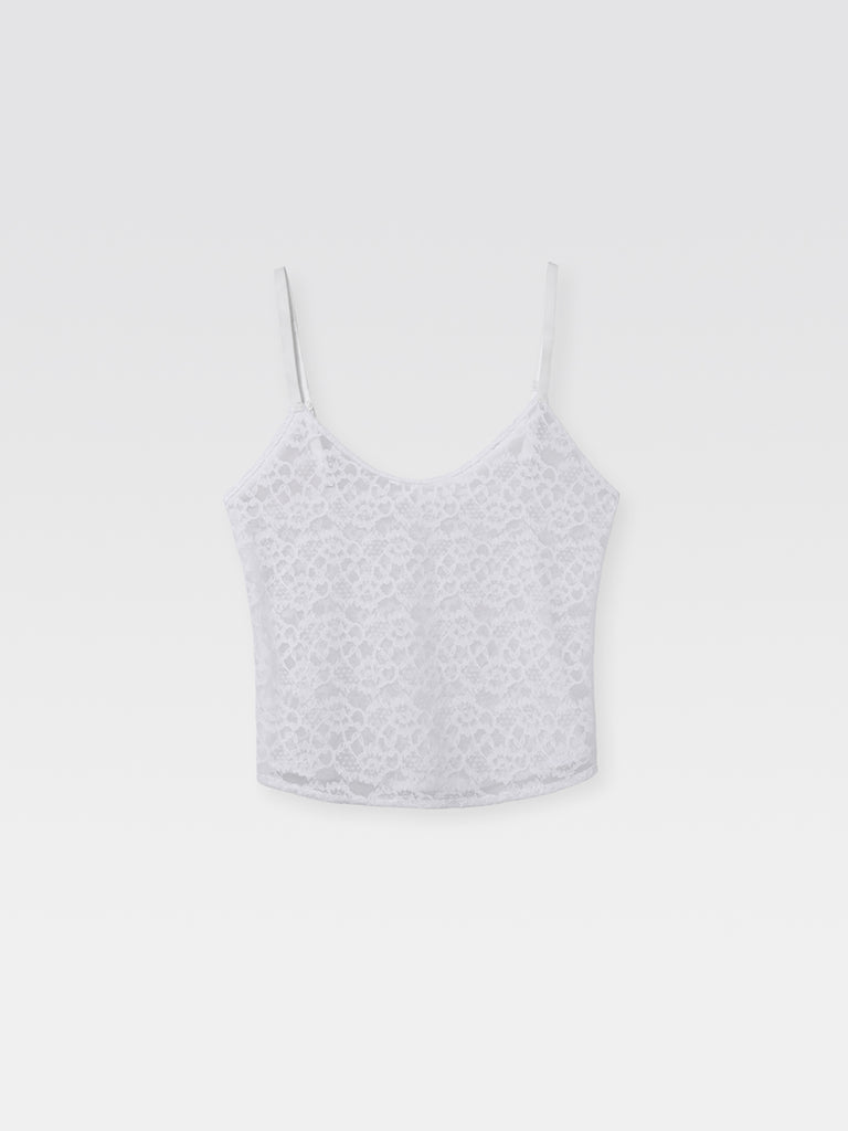 V-neck top with thin adjustable straps and embroidered floral details in white.