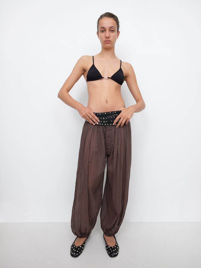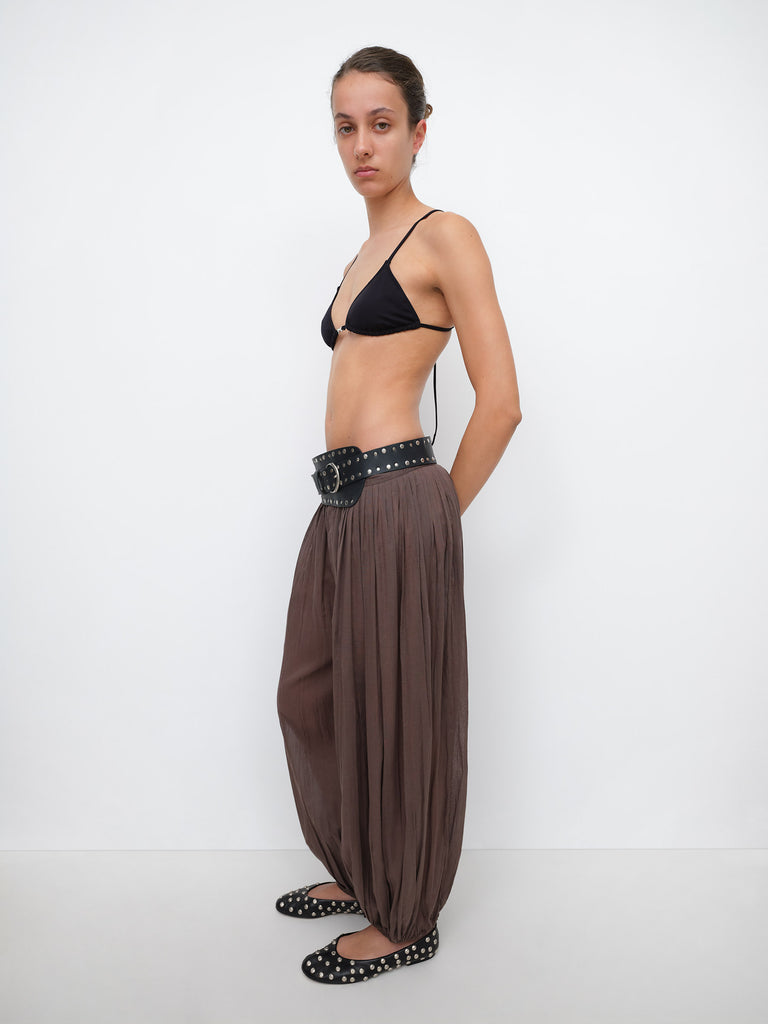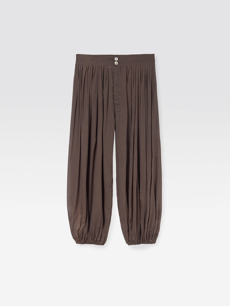 Brown women's cotton high-waisted trousers with gathered construction and elastic cuffs. Designed with wide-leg silhouette and tonal waistband. Lightweight, loose fit.