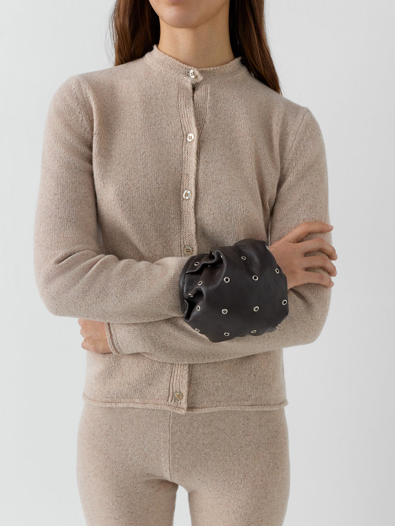 Brown leather wristlet bag with silver eyelets, zip closure and detachable chain.