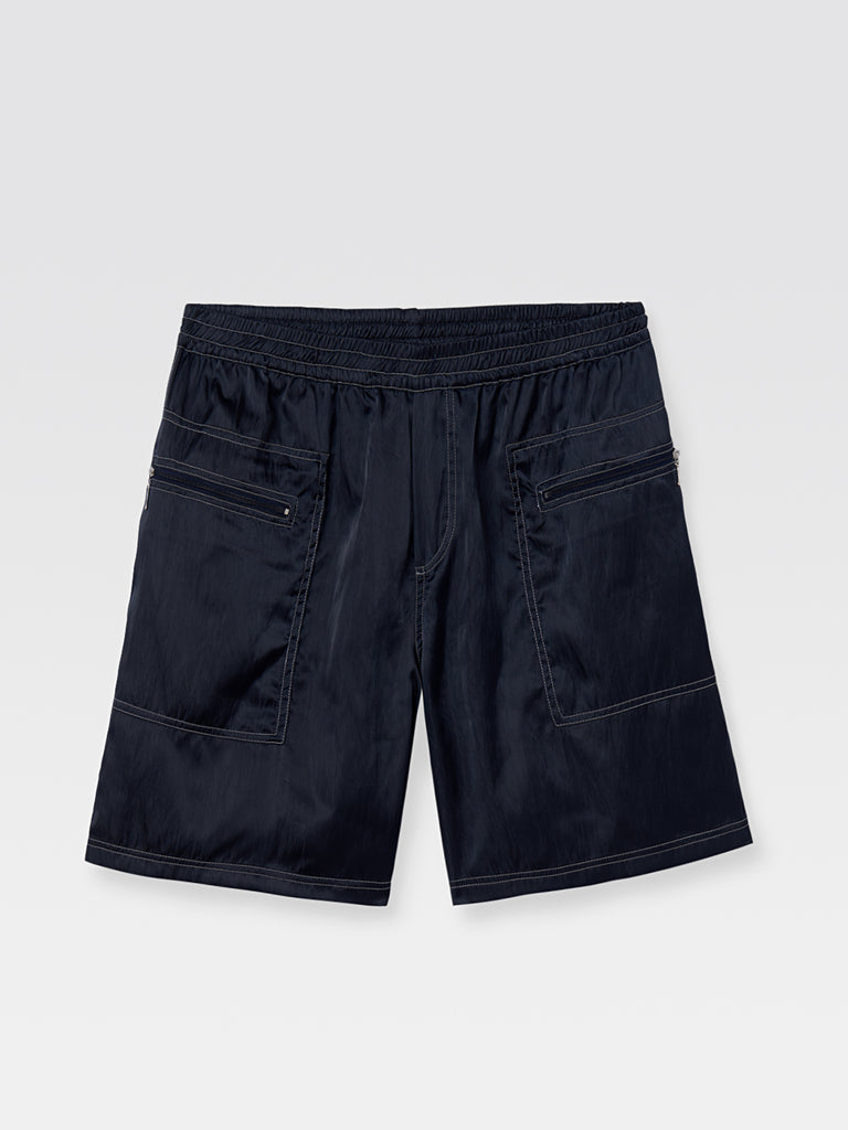 Bermuda pants in navy made in a windbreaker fabric, with drawstring, welt zip pockets and detailed seams in white.