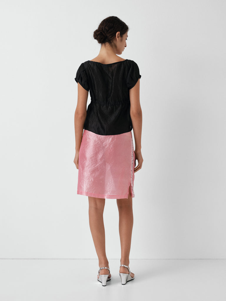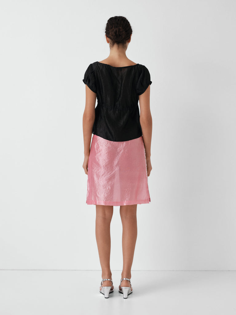 Black silk top with square neckline.