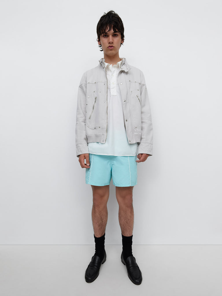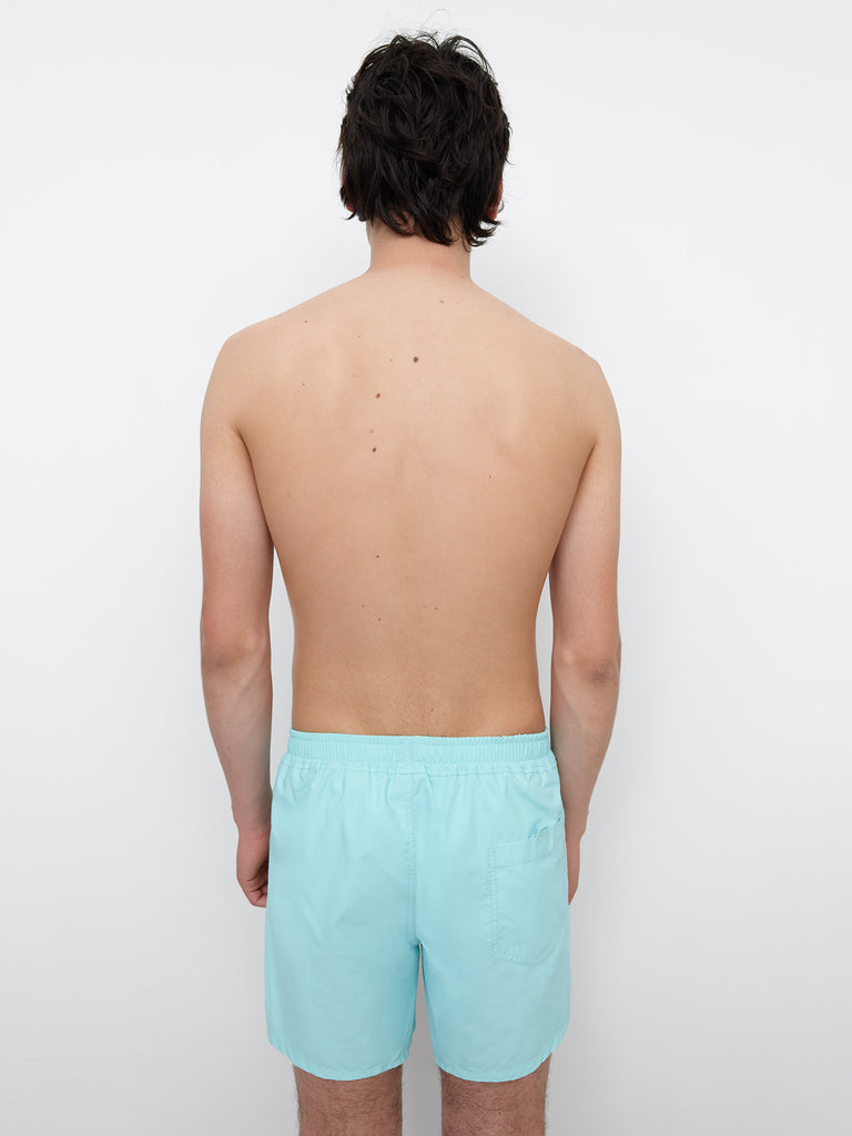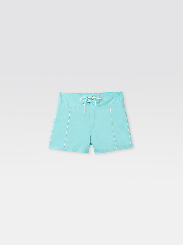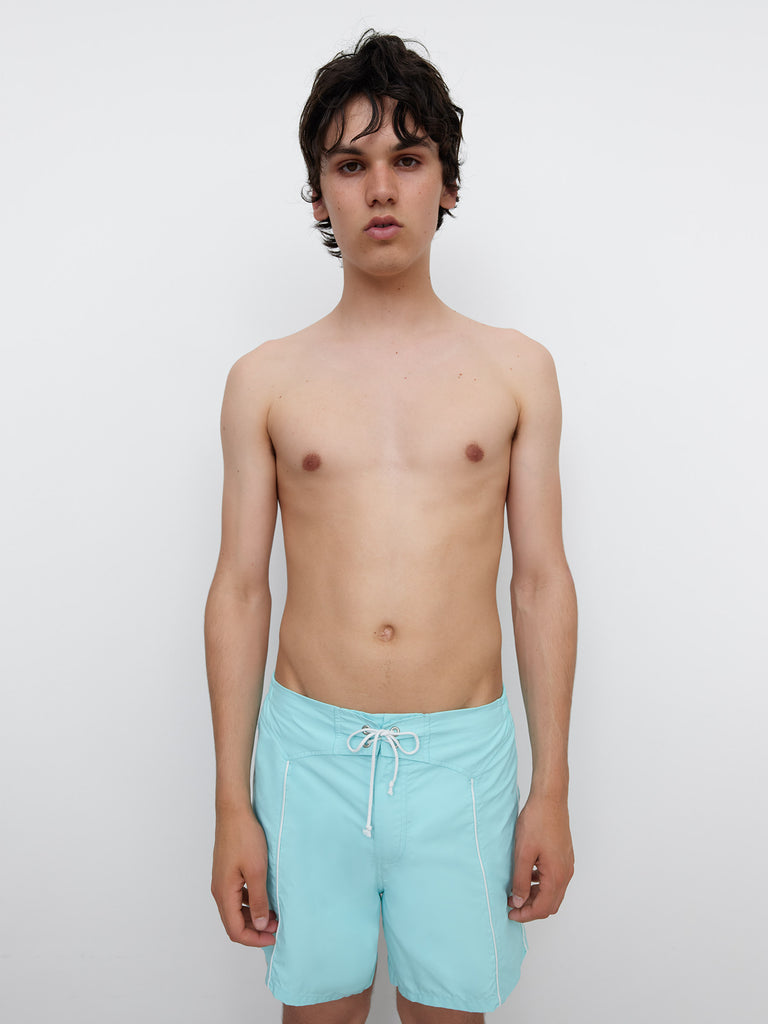 Light blue men’s swim shorts with contrast piping details. Designed with a structured waistband, back elastic, and x-shaped front closure with a zip and snap button. Features side seam pockets and an inner mesh lining.