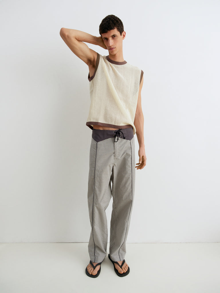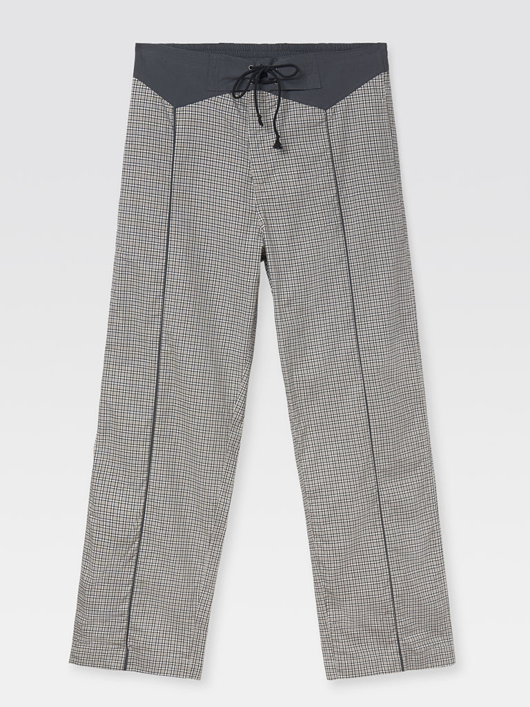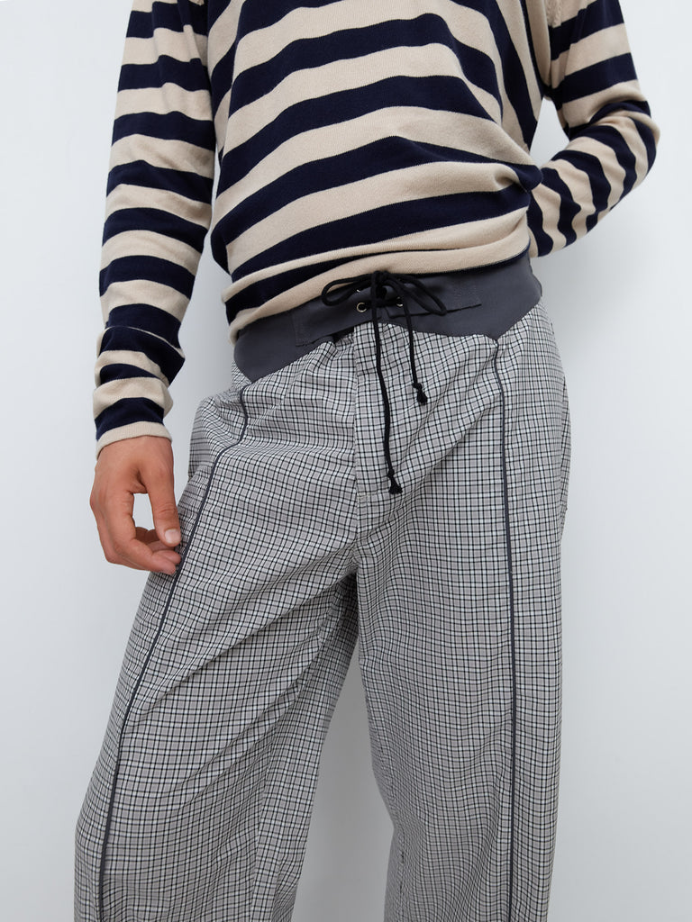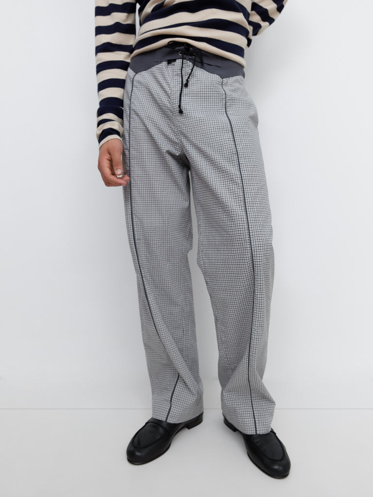 Grey checkered trousers with contrast waistband. Designed with a straight-leg fit, featuring a structured waistband with an adjustable x-shaped drawstring and elasticated back. Detailed with a contrasting vertical piping along the leg and discreet side seam pockets. It can also be worn for woman and men.