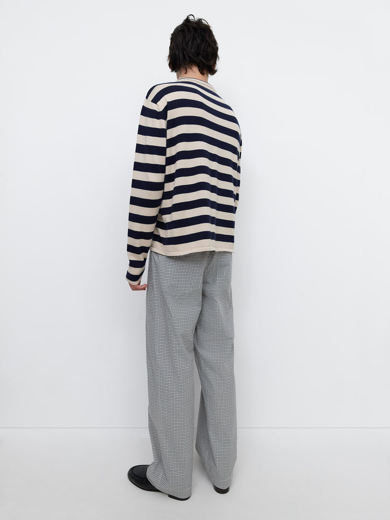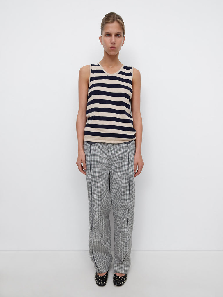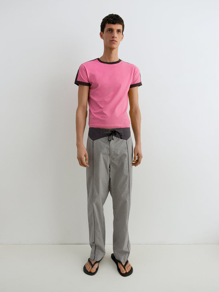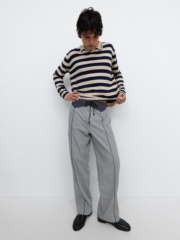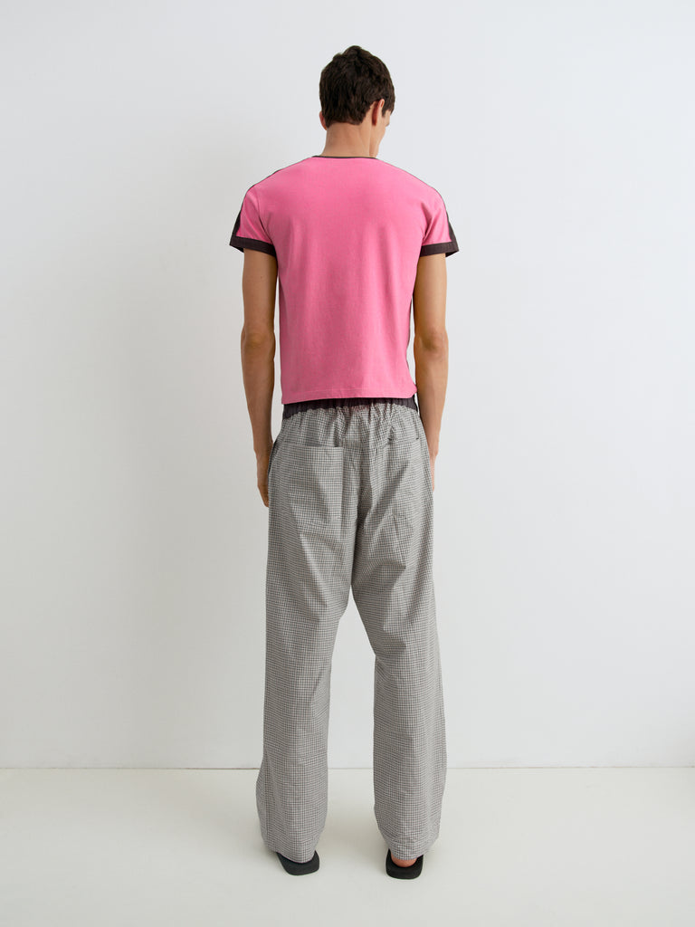 Grey checkered trousers with contrast waistband. Designed with a straight-leg fit, featuring a structured waistband with an adjustable x-shaped drawstring and elasticated back. Detailed with a contrasting vertical piping along the leg and discreet side seam pockets. It can also be worn for woman and men.