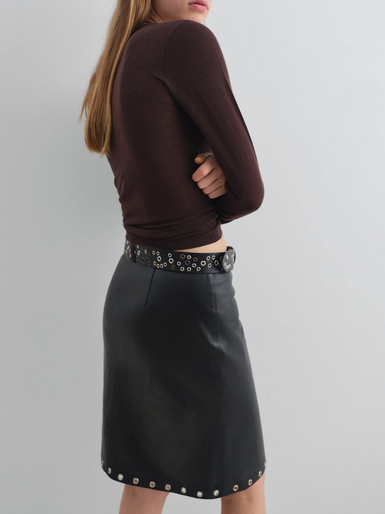 Brown fitted cardigan with round neckline.
