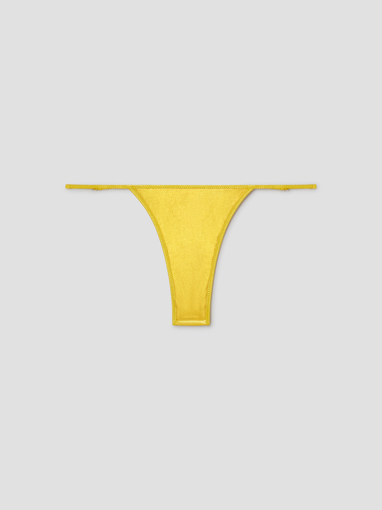 Yellow thong bikini bottom with a subtle metallic sheen.