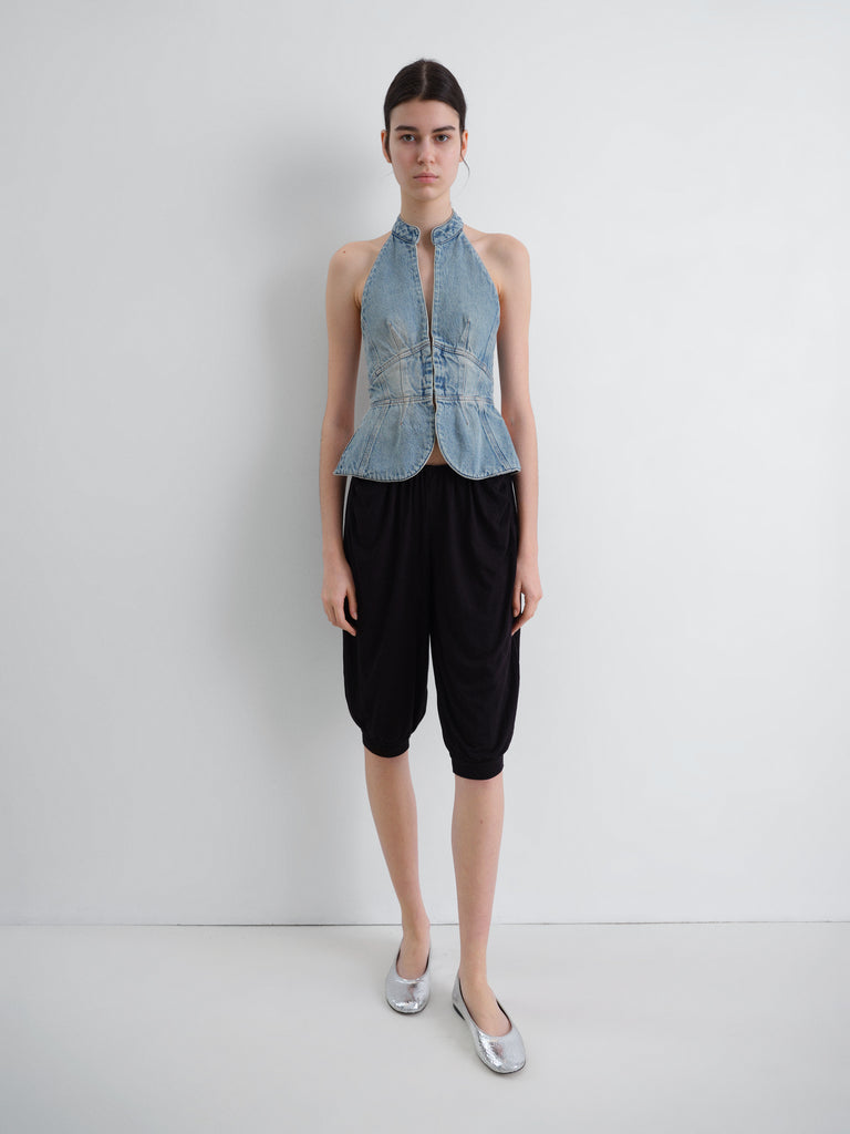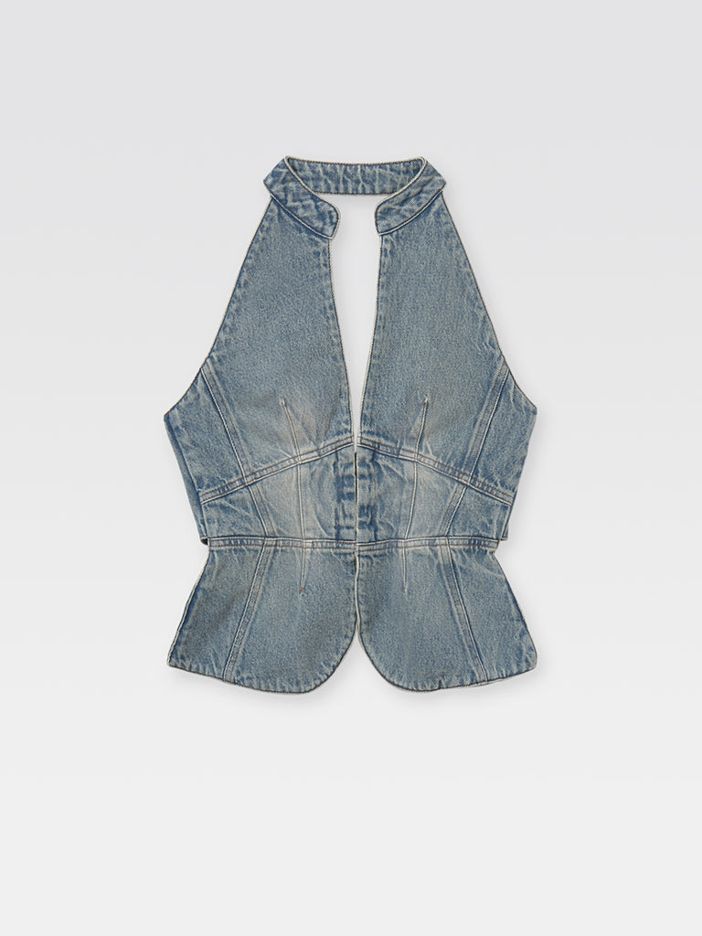 Light blue denim women’s top with a halter neckline and open back. Designed in a waistcoat style with contrast orange stitching and front snap closures. Washed denim effect.