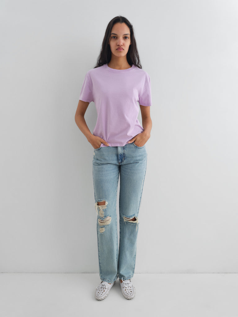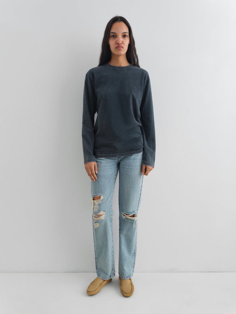 Blue distressed washed denim trousers with frayed details.