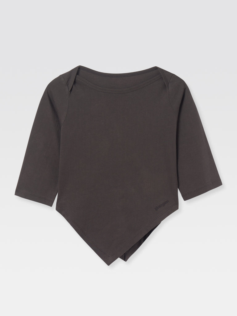 Three quarter length black t-shirt with irregular triangle shape hem.