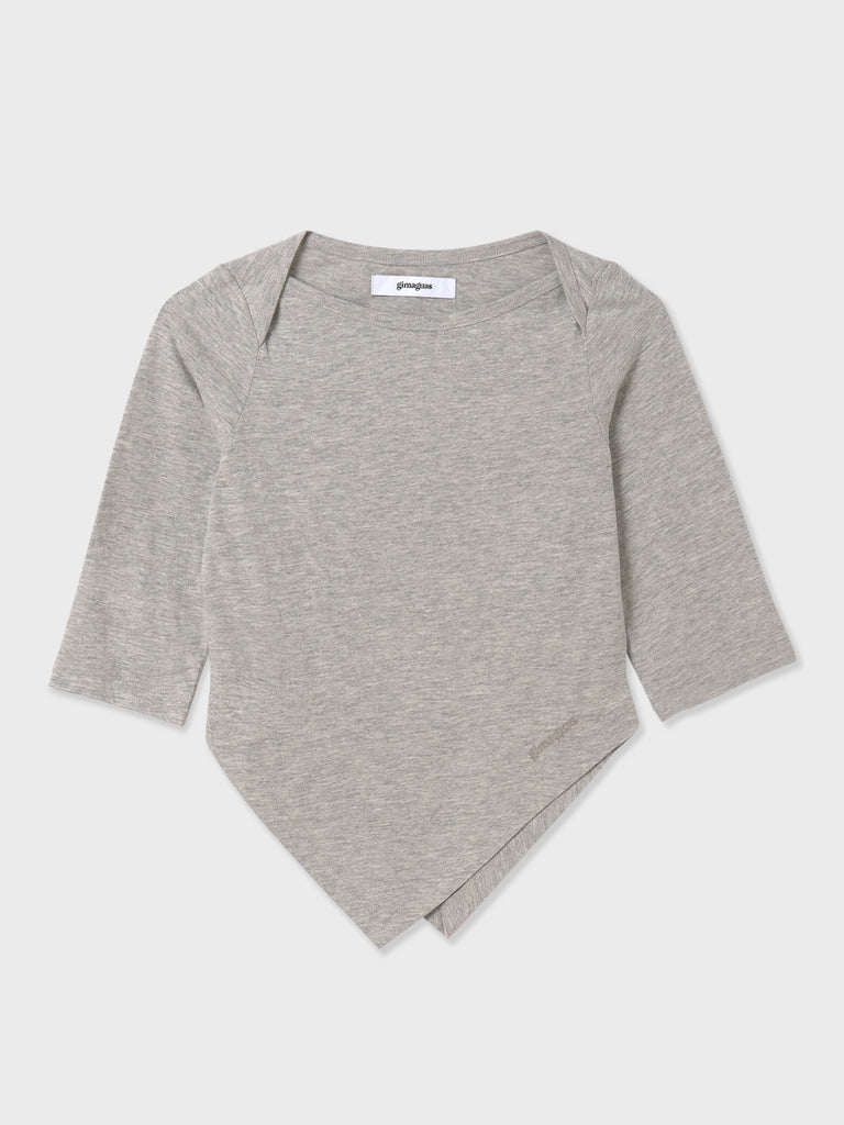 Three quarter length light grey t-shirt with irregular triangle shape hem.