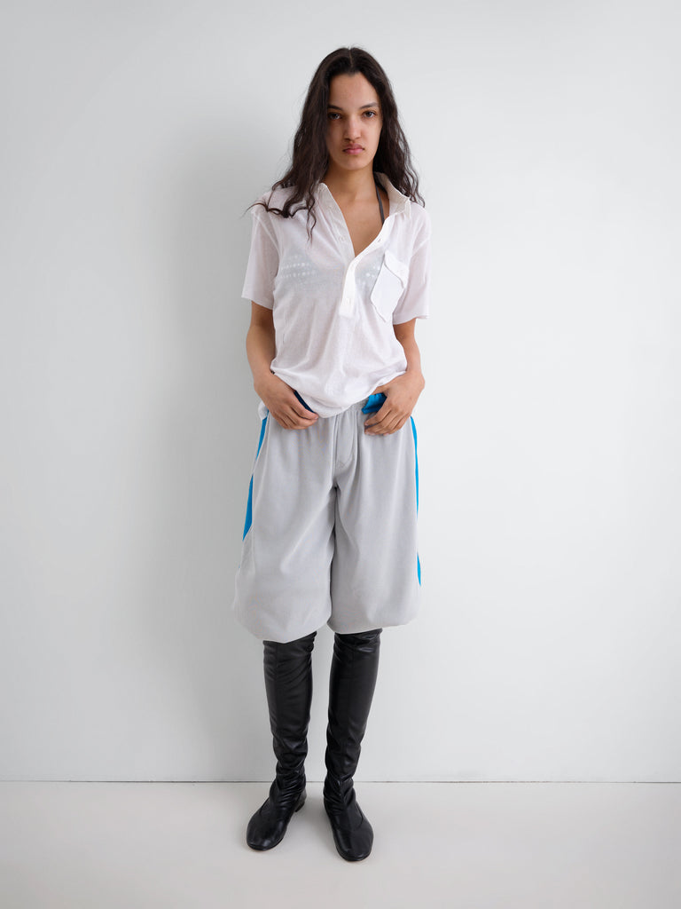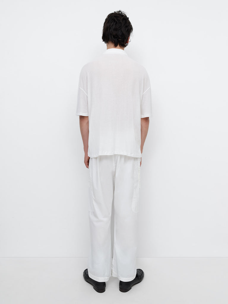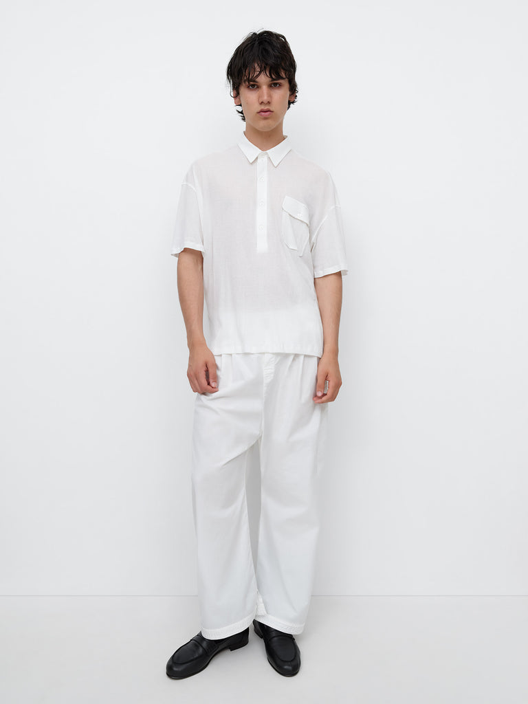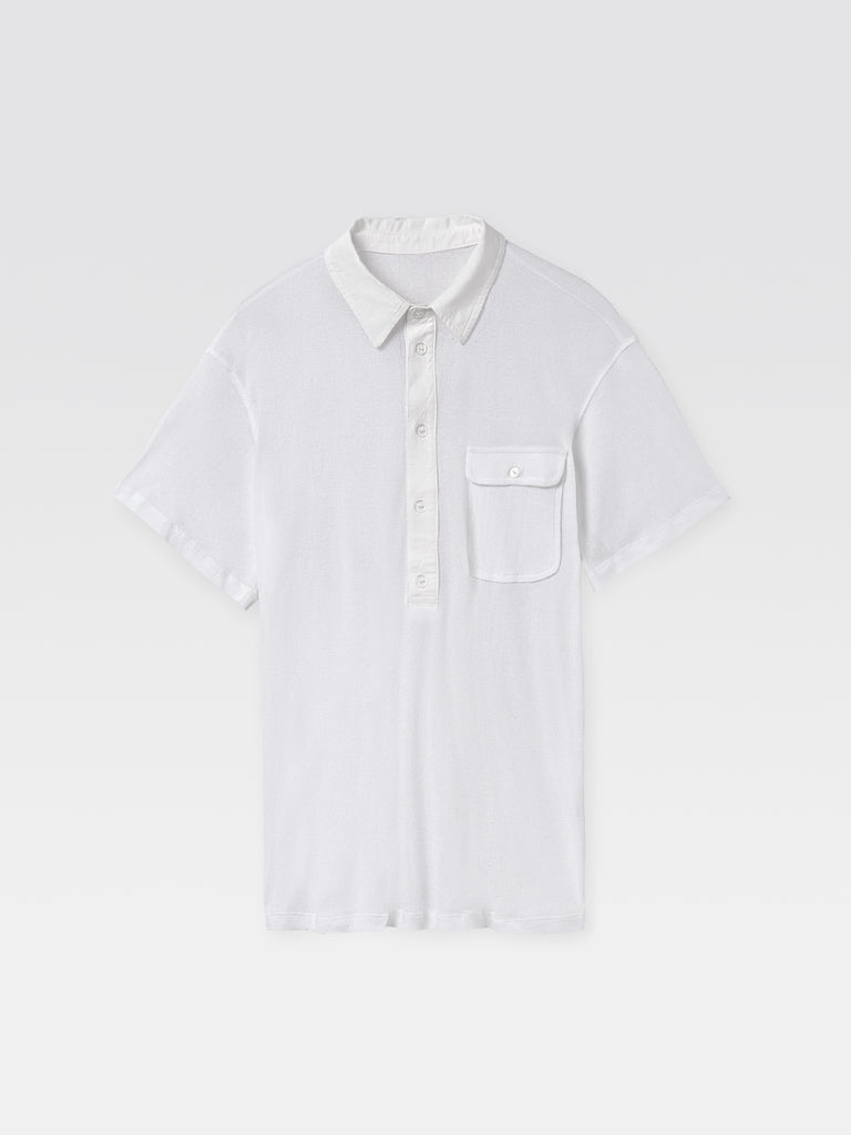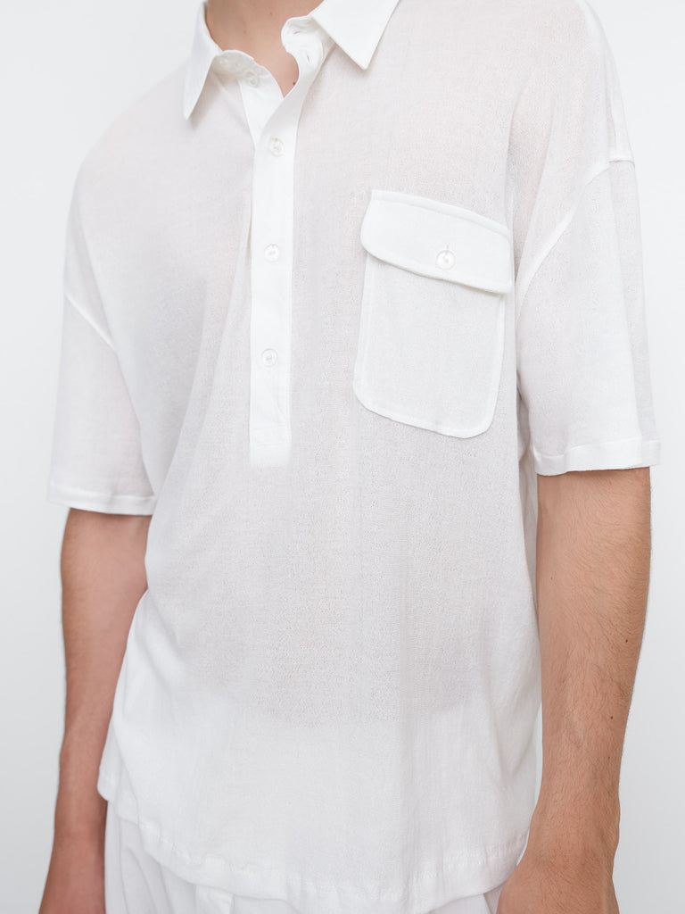 White semi-sheer short-sleeve polo. Perfect for women and men, designed in lightweight fabric with a contrasting structured collar and extended placket. Features a chest patch pocket with flap and button closure.