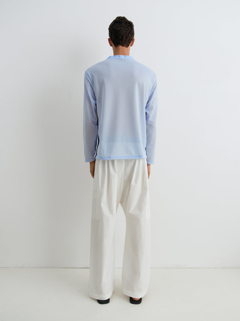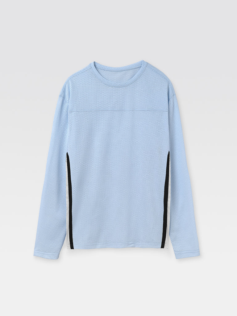 Light blue long-sleeve t-shirt. Perfect for women and men, designed in perforated technical fabric with contrasting black and white side panels. Features a slightly fitted silhouette, a crew neckline and a horizontal chest seam.